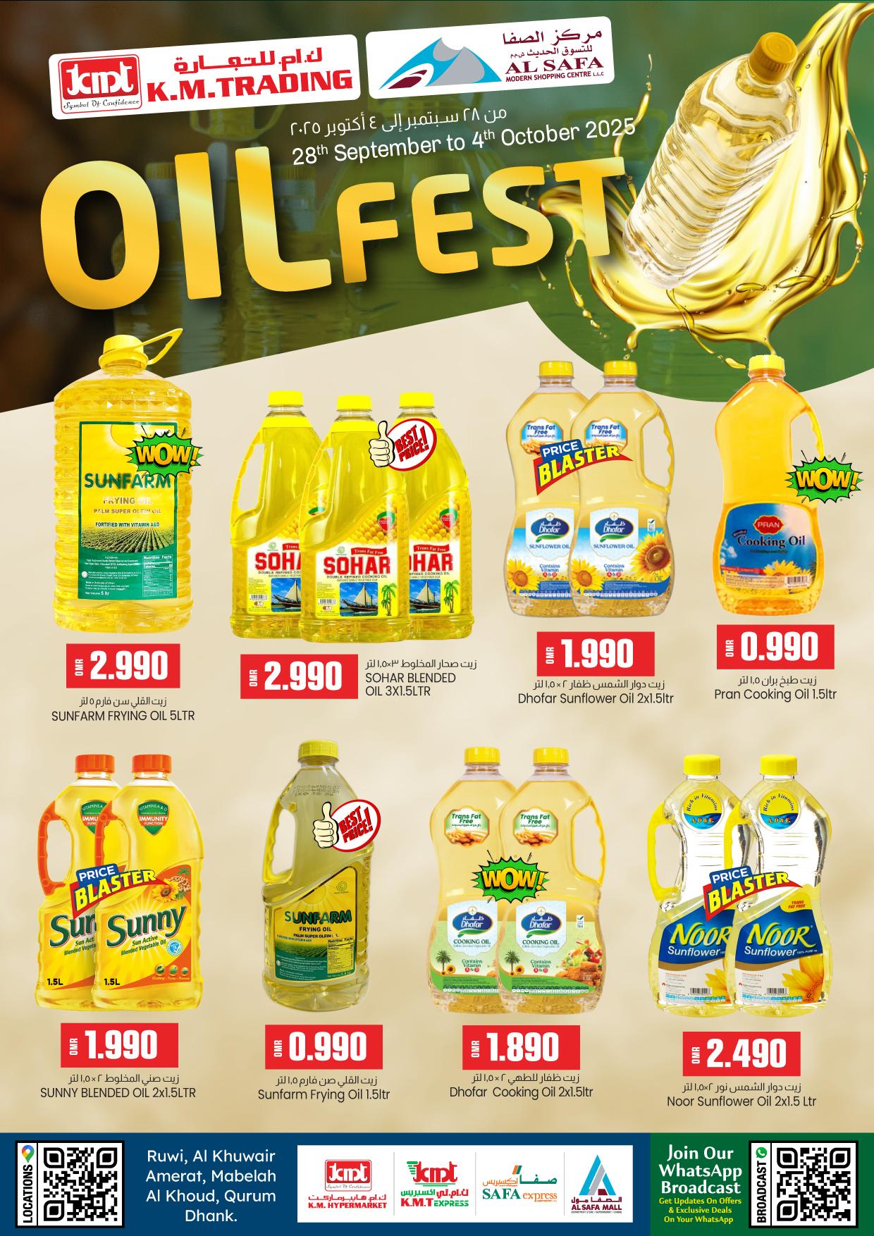 Don’t miss Oil Fest at K.M. Trading and Al Safa Stores in Oman. Get special prices on frying oil, sunflower oil, blended oil, palm oil, mustard oil, and olive oil. Offer valid till 4th October 2025 at: