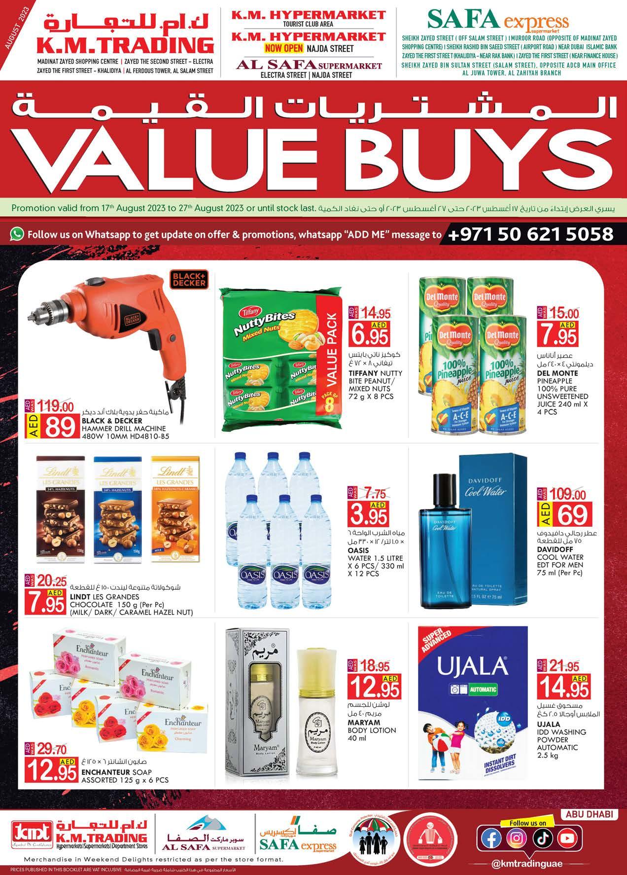 Value Buys Offer from August 17-27, 2023, KM Trading, Al SAFA and SAFA Express, Abu Dhabi. KM Trading, Al SAFA and SAFA Express Supermarket offer the Value Buys promotion for Abu Dhabi City stores to save money. Visit our supermarkets, hypermarkets and department stores in Abu Dhabi City to take advantage of these incredible deals.