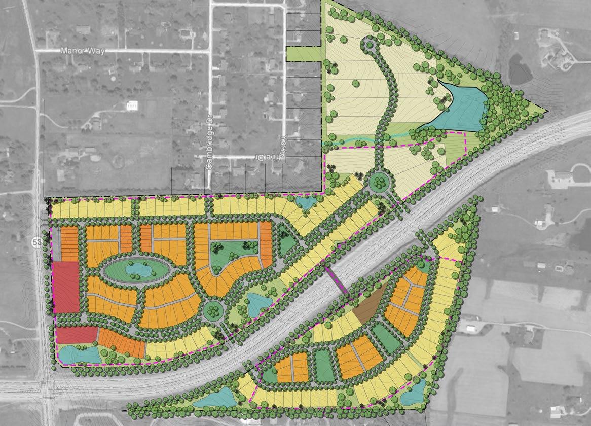 Heritage Hills is a new Traditional Neighborhood Development proposal for a private client in Shelbyville, KY. The site was particularly challenging as it is split into two by a highway, access in and out of the site had to be solved keeping in mind the traffic volume and speed of travel on the highway. The development had 4 major housing lot categories: deeper driveway lots that has access from the roads directly to the garage in the rear of the lot; wider alley lots where curb-cuts are minimized by creating access to the lots through a rear alley connecting individual garages; narrow town houses lining major streets and open spaces and finally larger estate lots to the north-east.