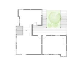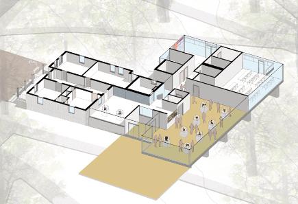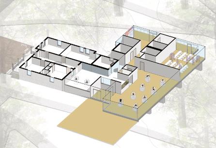 • A series of varied enclosures are experienced throughout the building. A closed porch leads to an open landscape followed by an enclosed space which terminates in an open workshop overlooking the lake/playground.