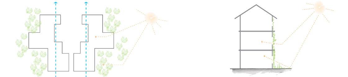 2 Extensive verandas Less moisture Cross ventilation Mutual shading East - west/ opening Roof space ventilation High ceiling Higher elevation High thermal capacity materials Conceptual Section Conceptual Interior Section