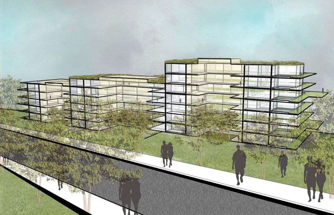 Master plan at Coral Hollow proposes a framework plan for a privately owned land, only using Katerra’s manufactured kit-of-parts building. The site was intended to be used as a “model-site” to showcase the various manufactured building typologies.