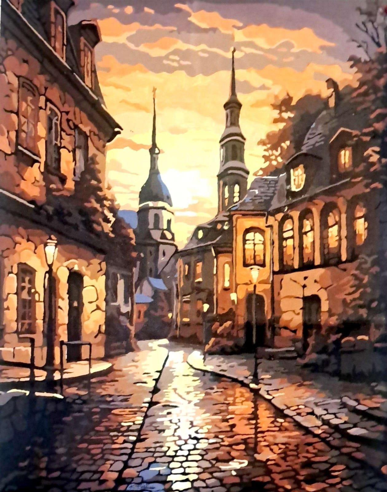 “Europeanvillagestreetatdusk cobblestonesreflectlanternlightbeneathgoldenspires.”