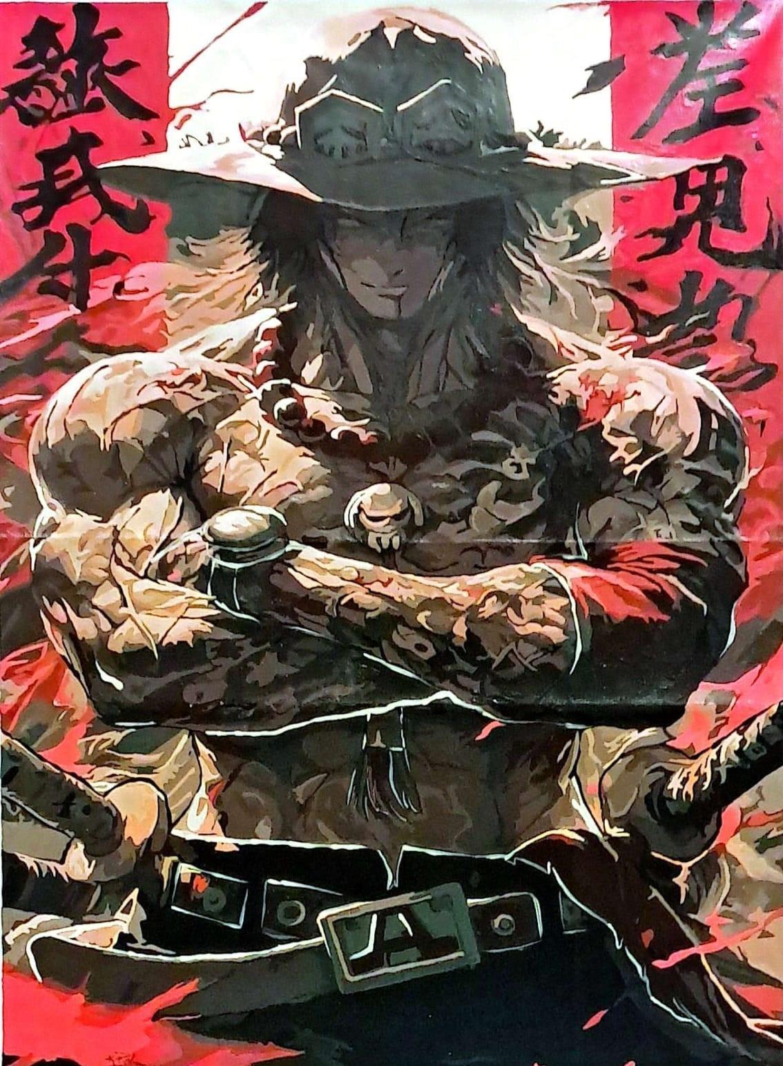 D.Luffystandsdefiant strawhatbold,redkanjiflameshisunyieldingpiratespirit.”