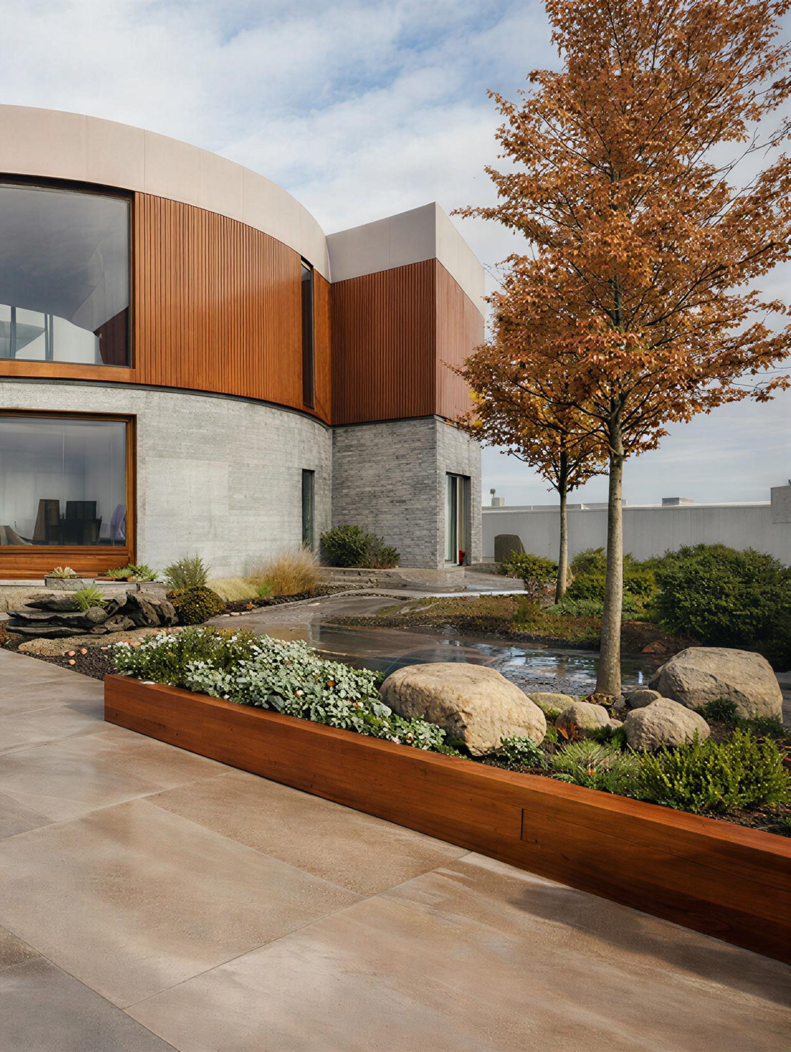 • Wooden veneer – Vertical façade cladding and stepped seating
