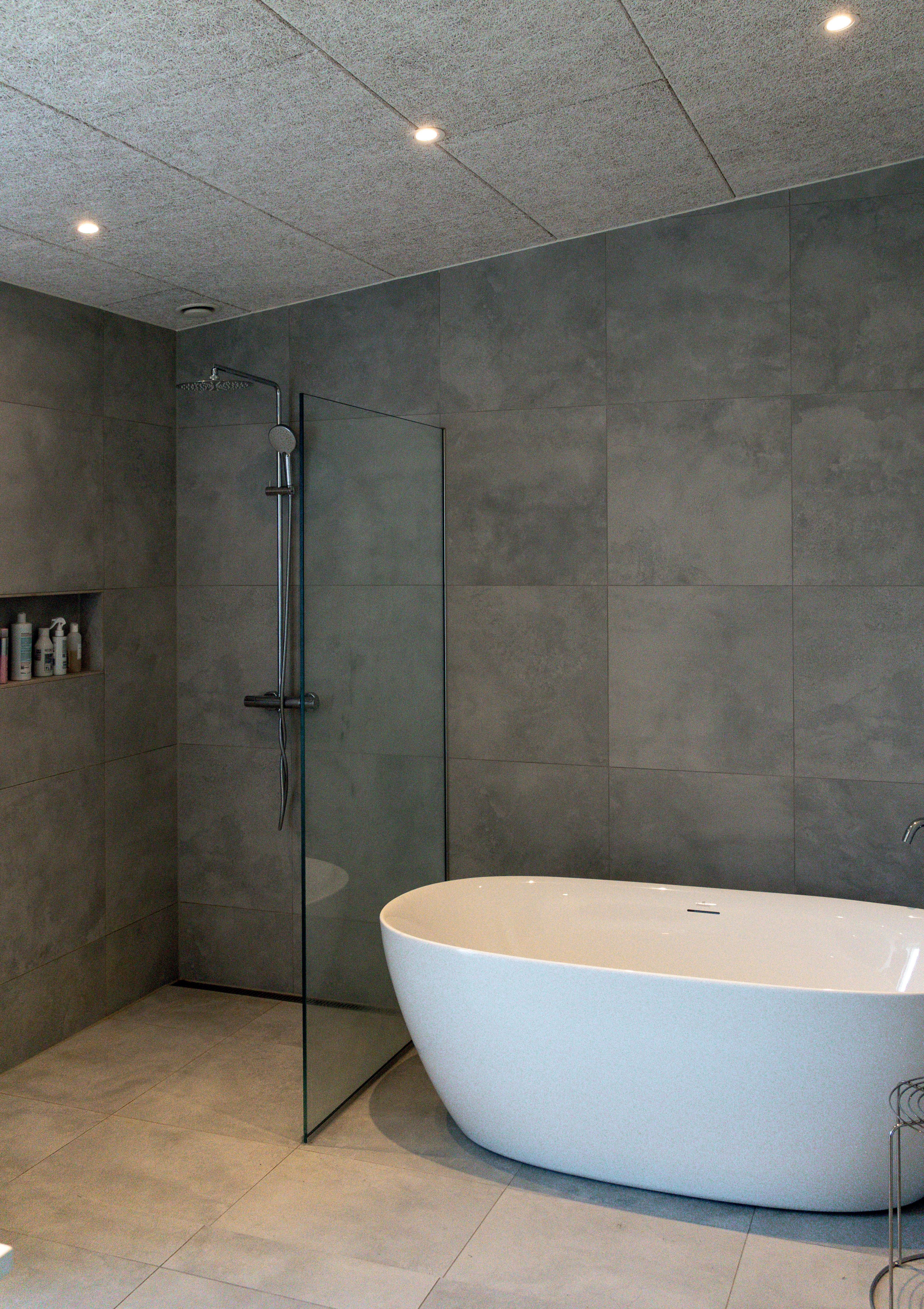 ”Badeværelset er det allerhelligste rum for os. Det har en dobbelt bruser, og vi har lagt stor vægt på fald og afløb, så det fungerer optimalt – det er virkelig dejligt.”