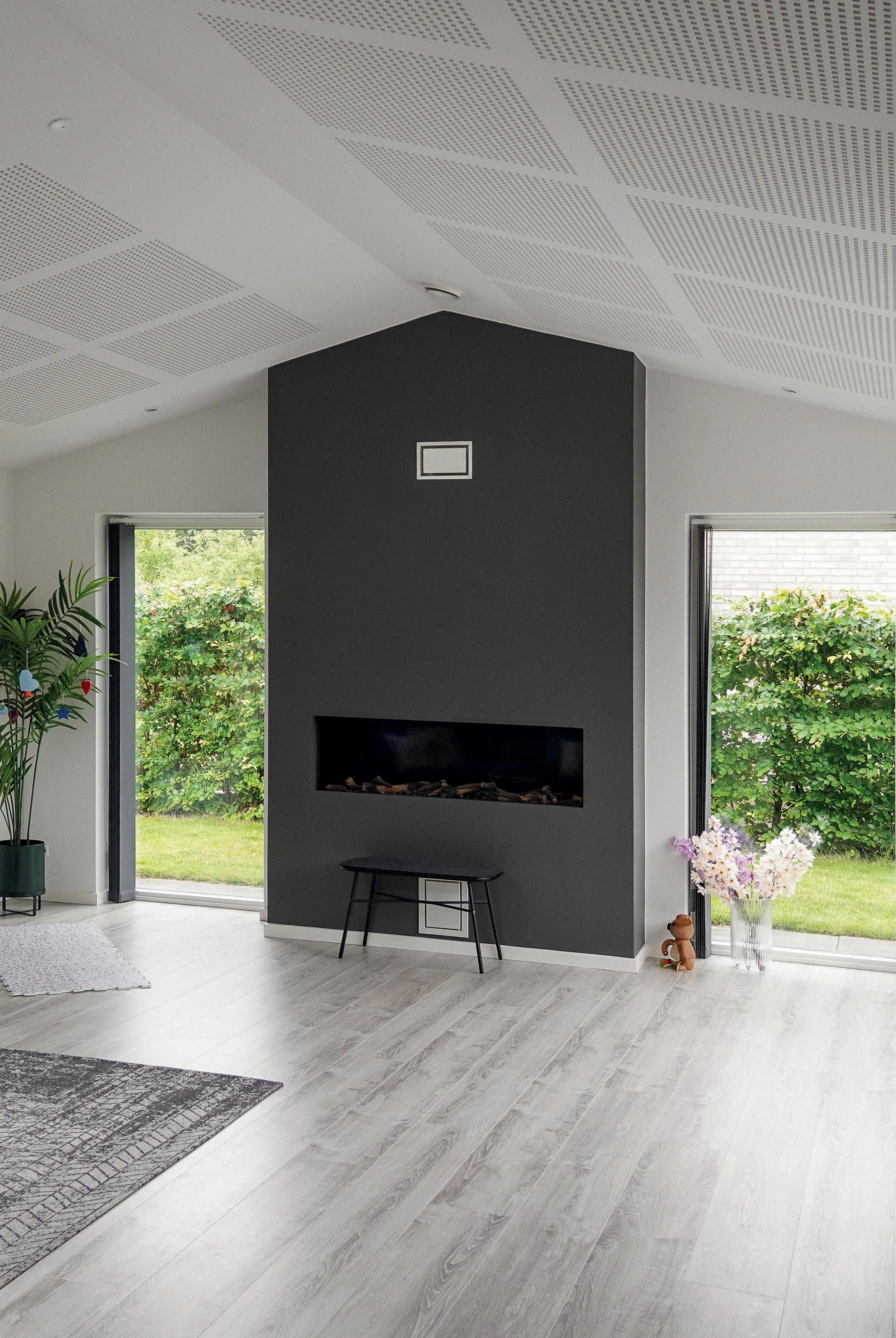 Gang, køkken-alrum og stue ligger i åben forbindelse med hinanden, hvilket kan skabe lydgener.