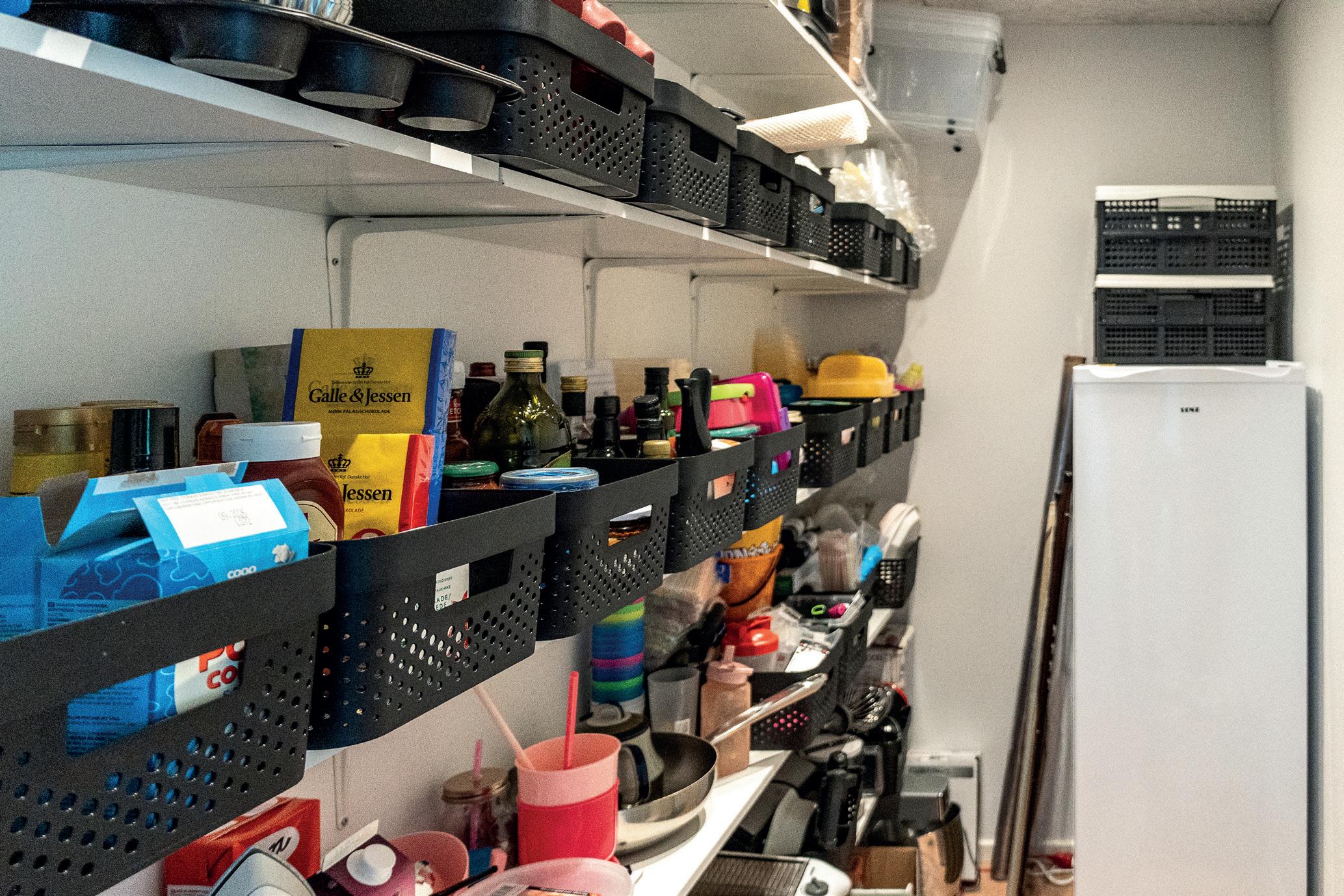 Der er lidt strukturelt rod, og det føles næsten pinligt at vise frem, men vi manglede dette rum i det gamle hus. Her kan vi samle alt det, der roder, og få adgang til det. Vi handler sjældent stort, mest vores to store drenge i sommerferien, men ellers bruges rummet primært til opbevaring af maskiner, som før stod bagerst i skabene.