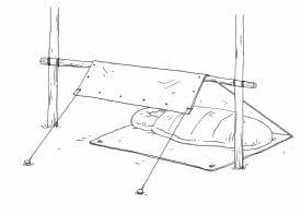 (tauet bør da være 4,5–5 meter langt). Pluggene kan du lage av kraftige grener eller bruke medbragte plugger. Har du mulighet til å bruke tverrstokk i åpningen, kan du fint bruke en skråstokk (eller tau) på midten også. Det vil hjelpe med å holde duken jevnt oppe.
