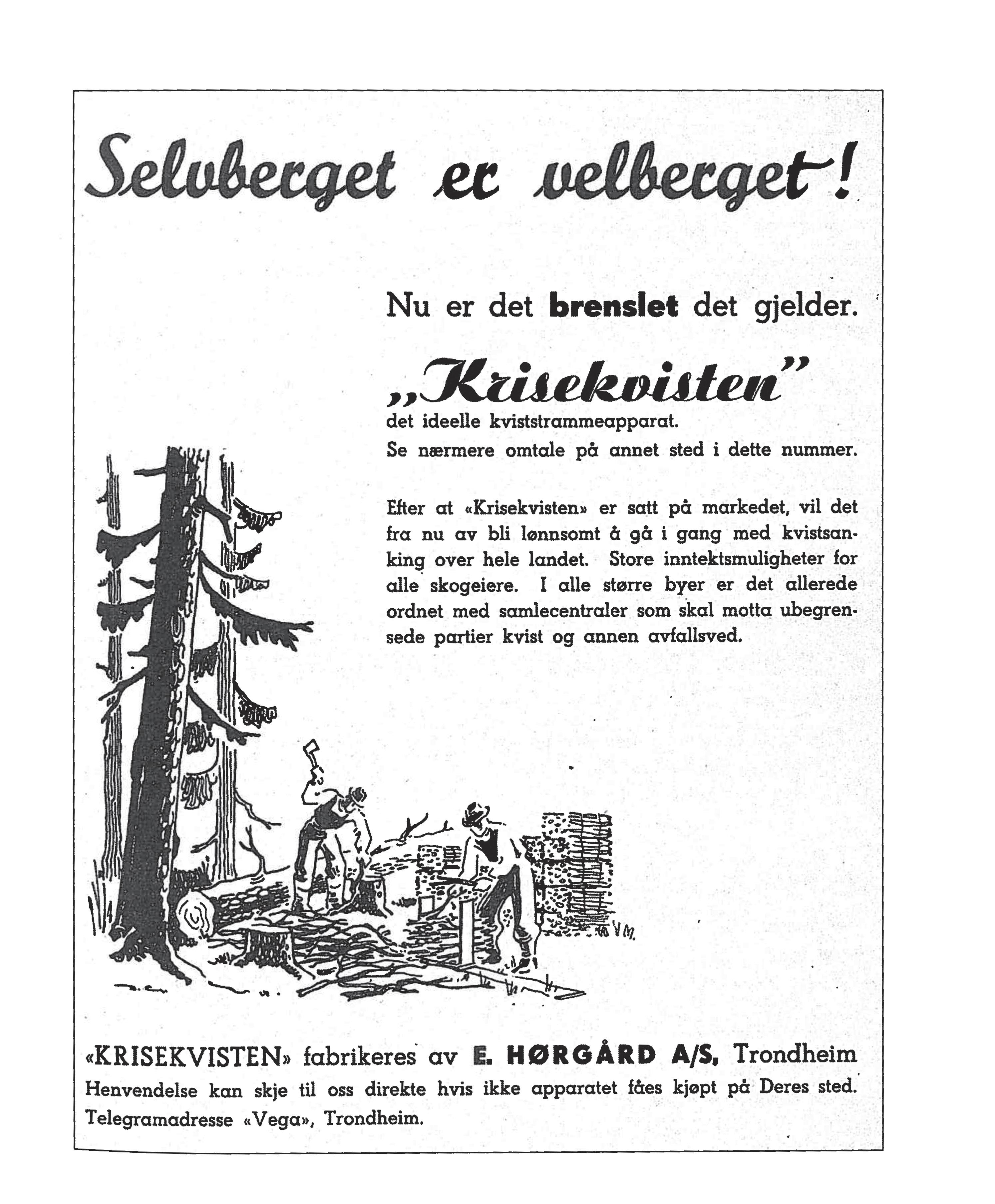 Neste side: Under krigen ble kvistens høye brennverdi verdsatt, og strammeapparatet «Krisekvisten» ble brukt for å surre den i bunt. To lengder wire ble lagt om kvisten og hektet på en aksling, som ble sveivet så wiren strammet seg. Faksimile fra Skogeieren i 1940. Nøysomme idealister har i ettertid laget egne versjoner av «Krisekvisten» ut fra Hørgårds patenttegninger (over).