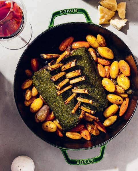 Lammecarré med urter og parmesan, bakte røtter 144 Langtidsstekt svinenakke i soya og kimchi 158