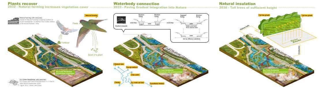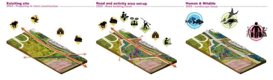 Exisiting site Road and activity area set-up Human & Wildlife 2023 Preparing to start construction 2026 Road building finish 2029 - Landscape finish