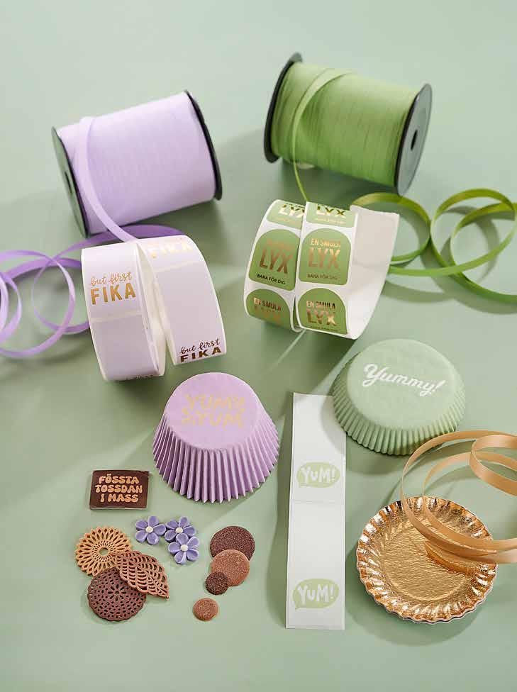 758401 Bakelsebricka guld ø95 mm, 50 st 807581 Polyband matt rosa 10 mm, 250 m rulle 81703 Dekal 'Galet gott!' Orange 40x40 mm, 500 st 75782 Bricka Guld/silver ø18cm, 100 st 126731 Butterfly Pink 35x30 mm,120 st 127201 Lace Flower Amber ø40 mm, 216 st 126912 Daisy ø20 mm, 200 st 127301 Pink marguerite ø20 mm, 200 st