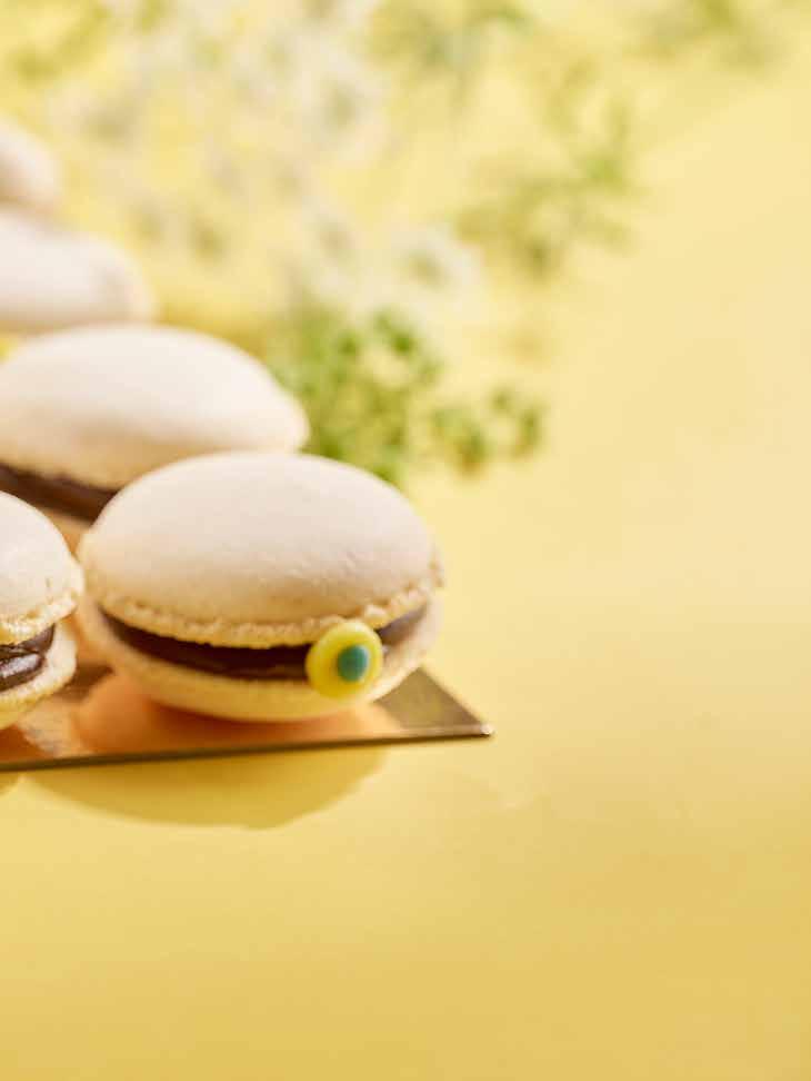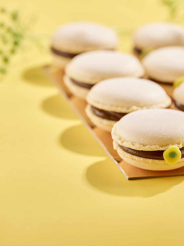Blanda Macaron Mix med vatten som är 45°C varmt. Blanda med vinge på medelhastighet i 4 minuter. Spritsa upp som en 5-krona på silipat eller bakplåtspapper. Baka på dubbla plåt. Låt svalna. Spritsa mörk tryffel i skalen och lägg ihop. Dekorera med gul och blå marsipan.