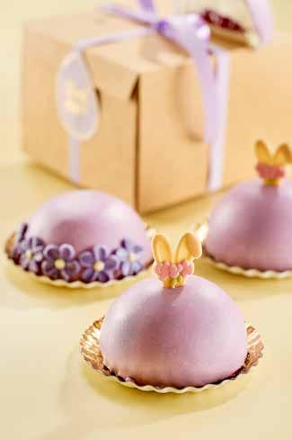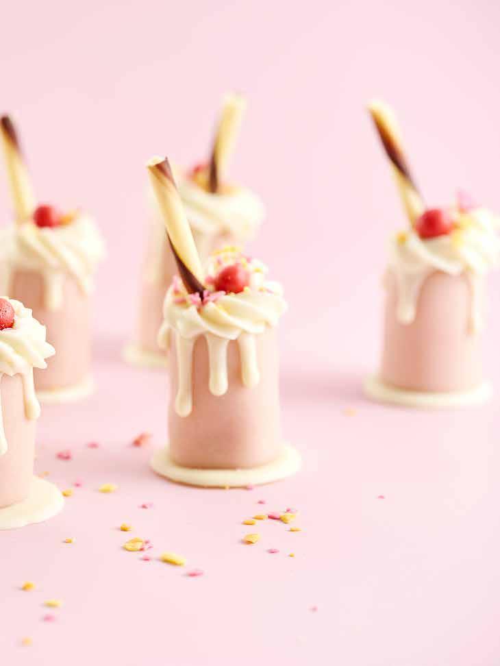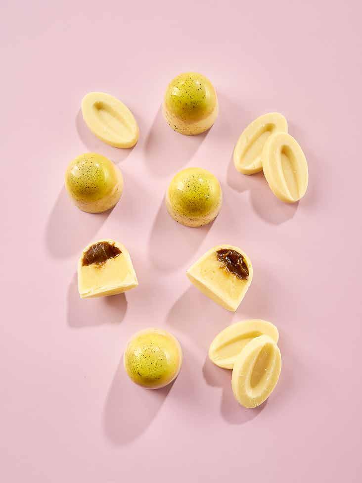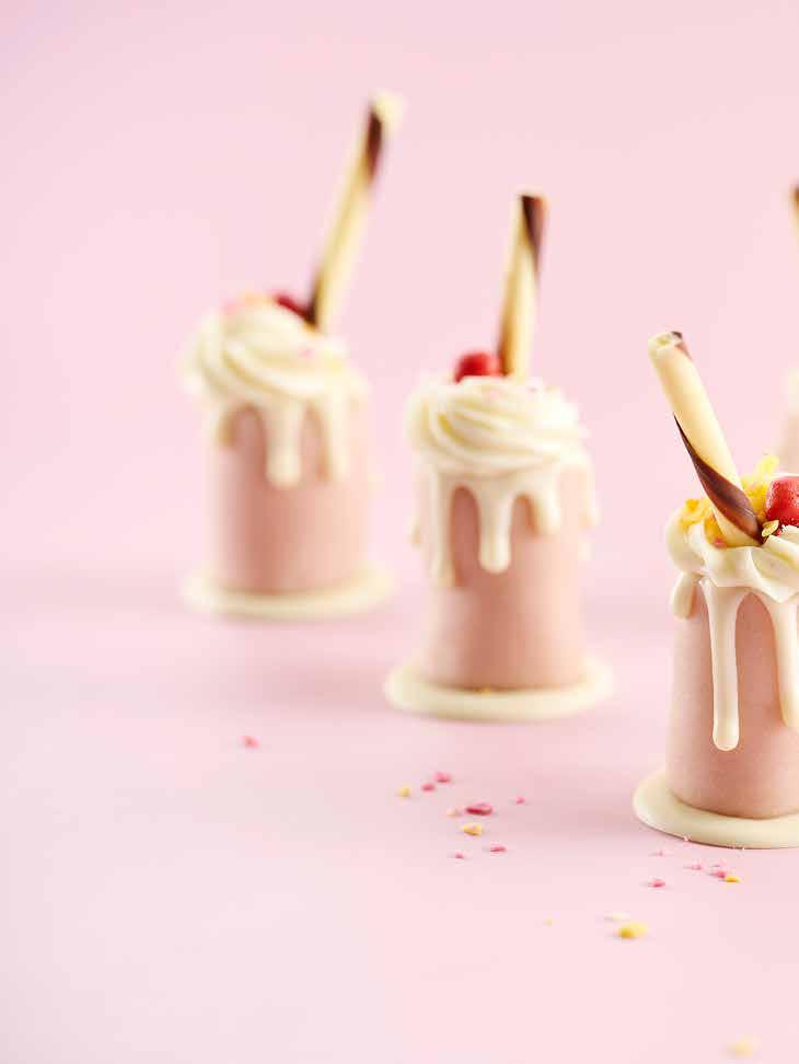 Värm försiktigt upp den vita tryffeln i micro till cirka 45°C och blanda ut Power Flowers till rosa färg. Ta ut moussekupolerna och glasera med rosa tryffel.