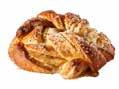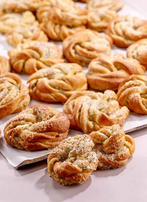 Kavla ut vetedegen till cirka 4 mm. Bred ut remons på hela degen och gör ett treslag. Forma till knutar. Låt jäsa i cirka 60 minuter. Baka av.