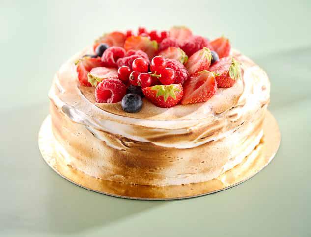 Täck hela tårtan i maräng. Bränn marängen lätt och dekorera med färska bär.