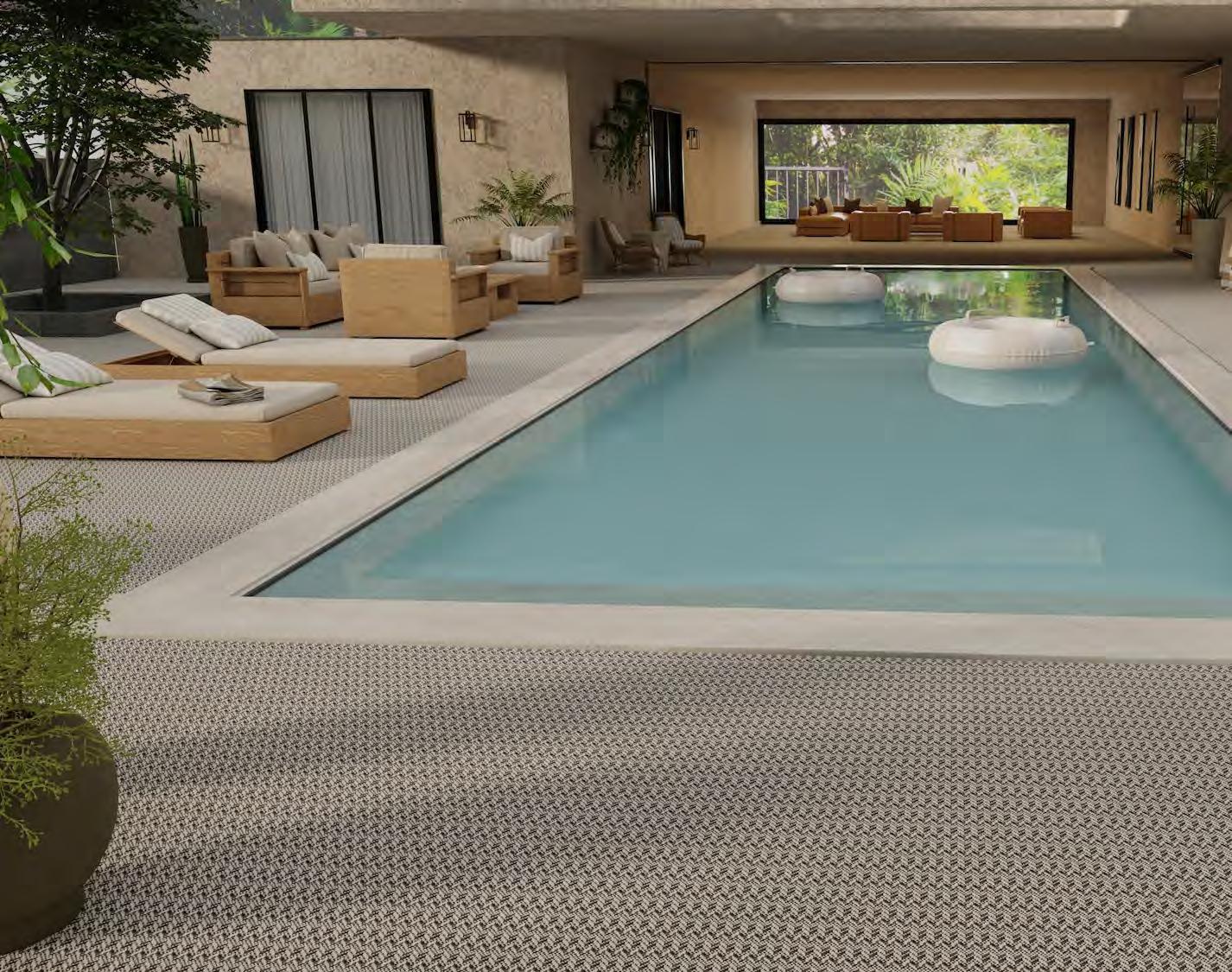A chic chevron design is expanded in size and dimension in the Strata collection. This large-scale zigzag pattern takes the static out of design equation to provide a sound foundation to any space.