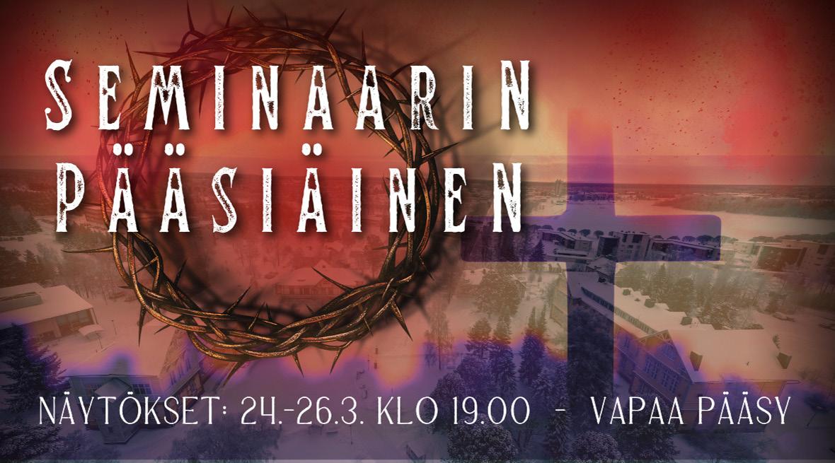 Pääsiäisen keskeiset tapahtumat kristillisenä draamana Raahen Seminaarin päärakennusten välisellä alueella su 24.3. klo 19, ma 25.3. klo 19 ja ti 26.3. klo 19. Kesto 1h 15min. Ei pääsymaksua, ei kynnyksiä, mutta lämmintä vaatetta ja hyvät kengät on syytä pukea ylle, koska kaikki tapahtuu ulkona taivasalla. Mukana esityksessä on myös iso kuoro. Jeesuksen roolissa seurakuntapastori Lauri Hämeenaho. Käsikirjoitus ja ohjaus Sari Jaatinen. Tuotanto: Raahen seurakunta.