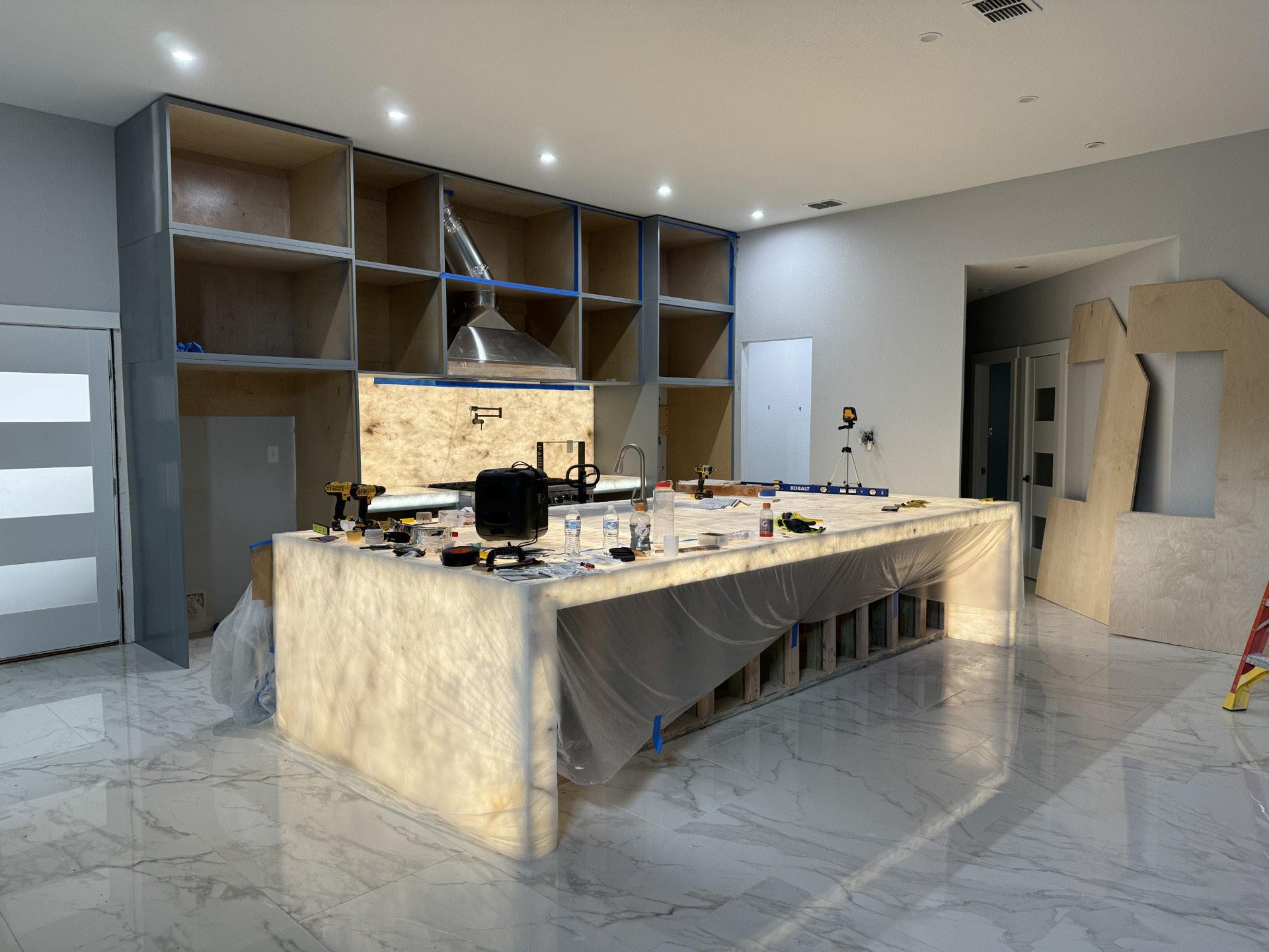 The countertops also changed the design of the cabinets. Backlit Onyx was envisioned, which altered the finished height of the completed cabinets. The lower cabinets are constructed at a shorter height to accomadate for the LED paneling and required offset for proper light diffusion.