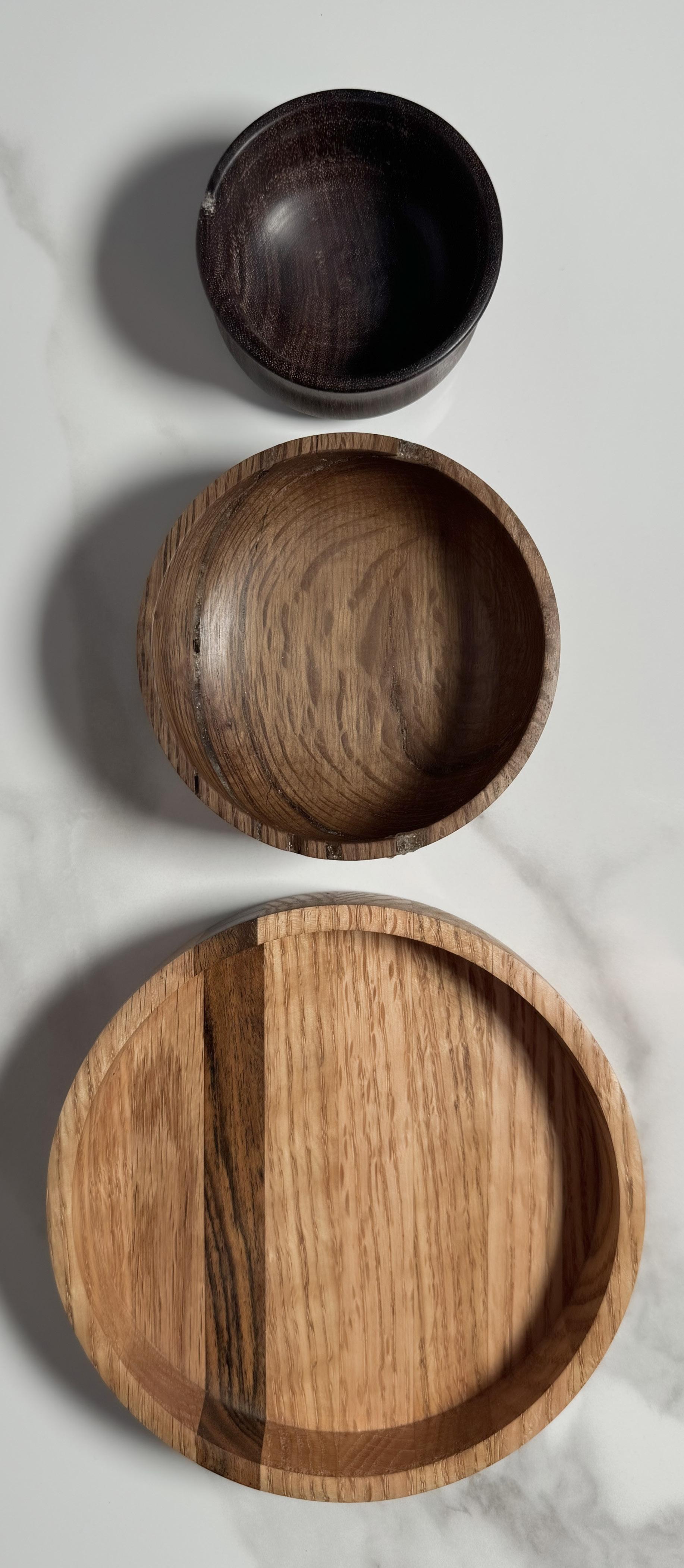 All pieces made by me in my wood shop. Species consist of Bacote, Ambrosia Maple, Granadillo, Live Oak, and White oak.