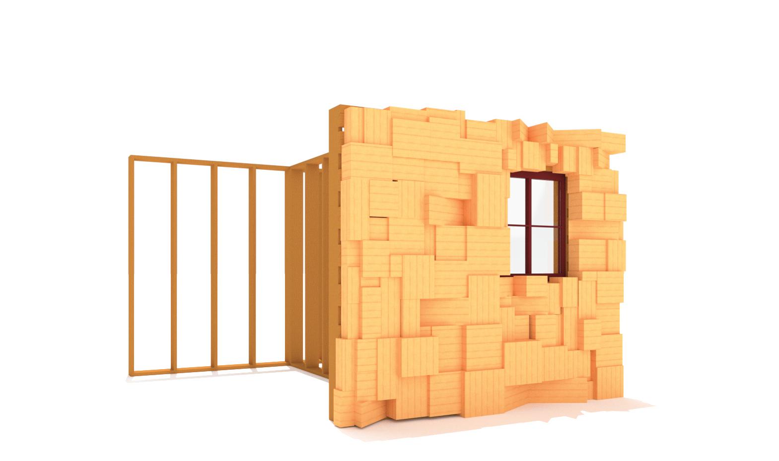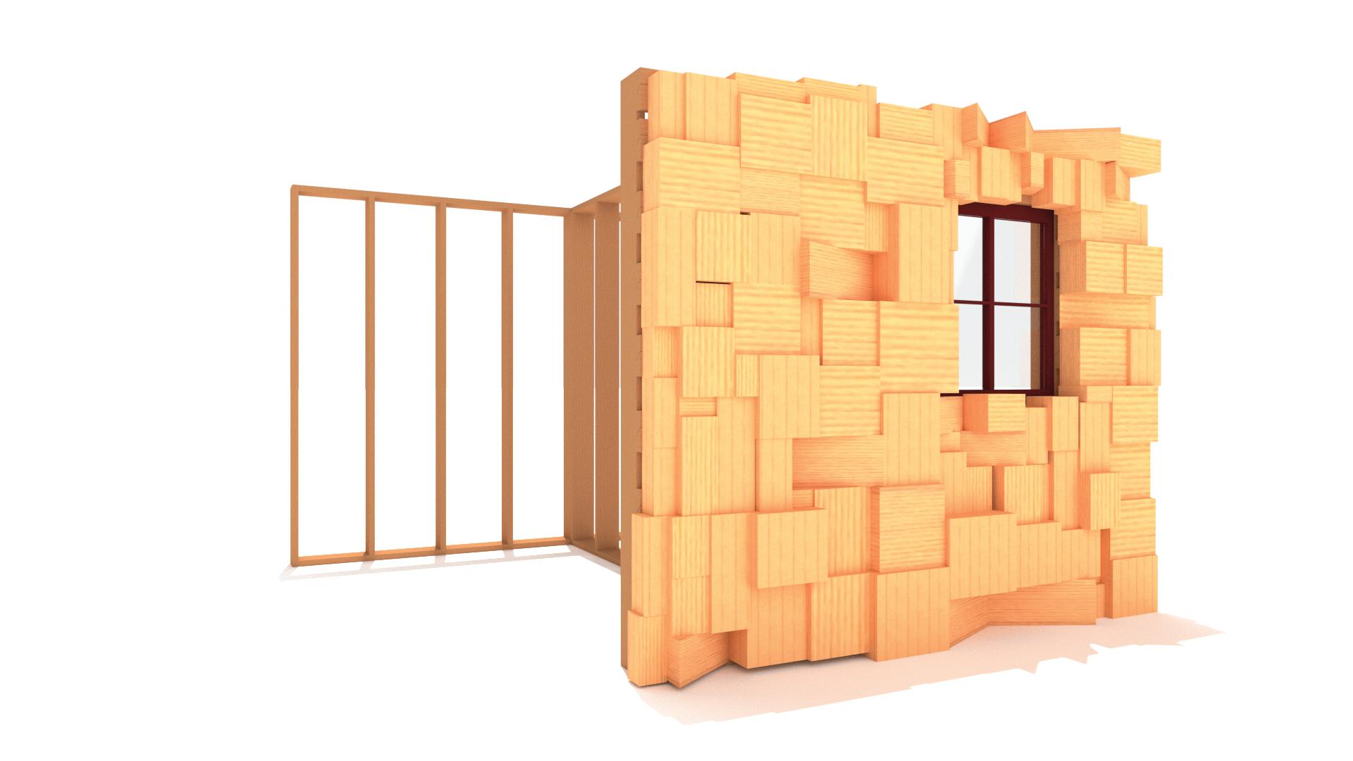 Phase 2 of the project saw the development of a cladding systen utilizing discarded chunks of reclaimed lumber. The lumber was taken from a local home builder called Timberlyne. The chunks are the result of all the CNC work done to the large beans and columns.