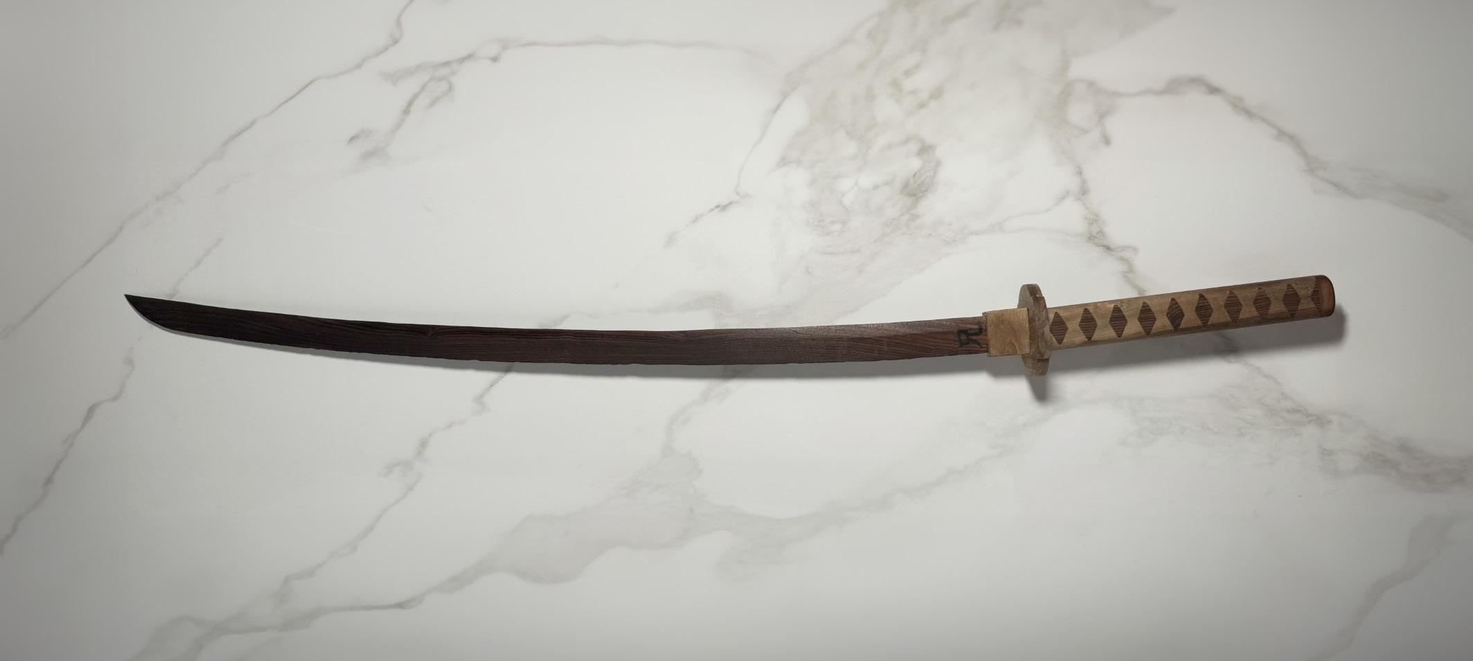 The model is constructed of Ambrosia Maple (Blade and Handle), Bocote (Dark decorative side), and Maple (Light decorative sides and swing arms). Danish oil coats the finished product.