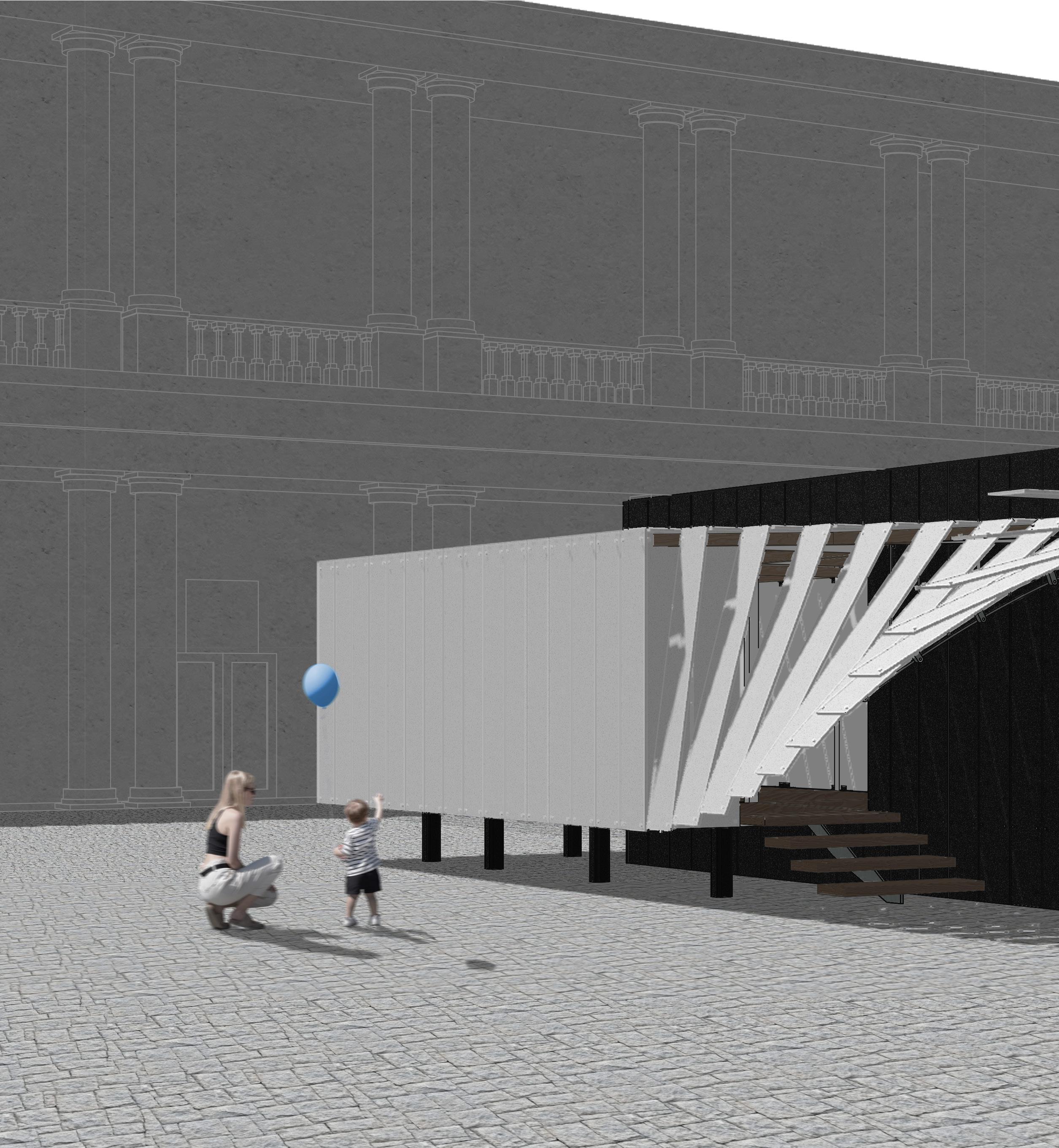 The frames are reimagined into architectural elements like railings and walls