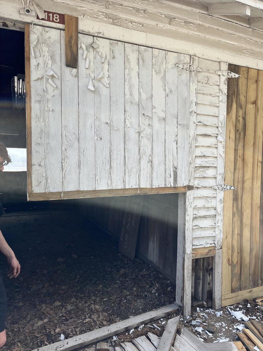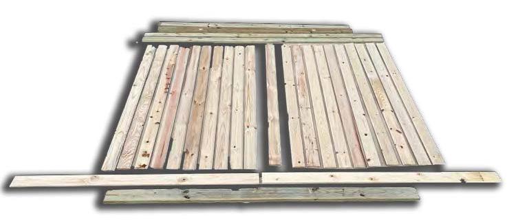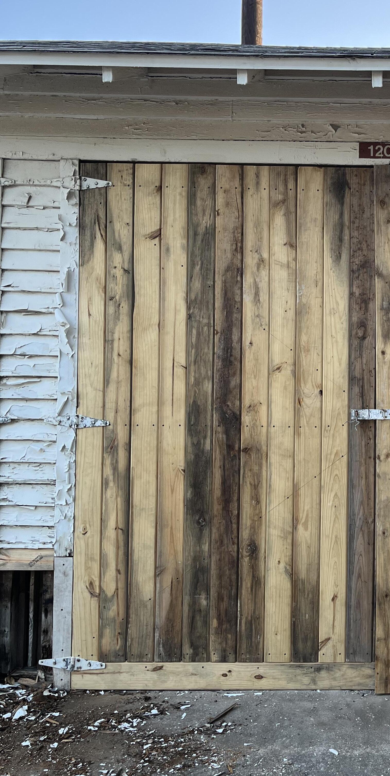 The reused material was salvaged from the preexisting doors. The main problem with the original doors was the rotting bottom from over-exposure to rain and weather over the years. By cutting the doors in half, the top cutoffs could become the new bottoms for another set.