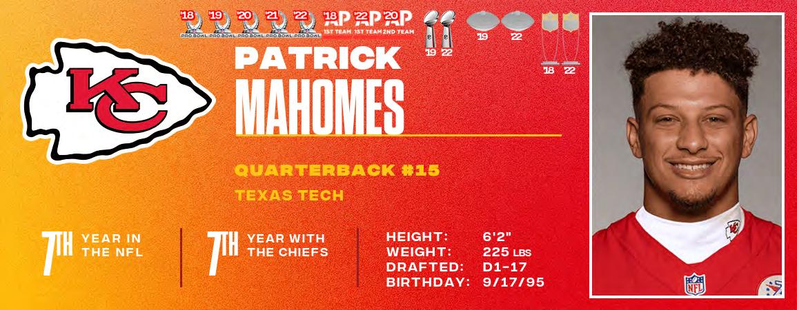 Chiefs QB Patrick Mahomes is in his sixth season as the club’s starting quarterback. As the starter, Mahomes has led the team to five-consecutive home AFC Championship Games, three Super Bowl appearances and earned NFL MVP (2018, 2022) and Super Bowl MVP honors (2019, 2022). Since 2018, he leads the league in yards (23,957), touchdowns (192), 25+ yard completions (206) and first down throws (1,183). With only 48 interceptions (since 2018), he owns a +144 TD/INT ratio, the highest mark of any active QB in that span. He owns 41 career games of 300+ passing yards. TE Travis Kelce has recorded an NFL record seven-straight 1,000yard receiving seasons (1,338 yards in 2022). He owns 35 games with 100+ receiving yards (most in NFL history for a tight end) and has caught at least one pass in 161 consecutive games (reg. and postseason). Since entering the NFL in 2013, Kelce leads all tight ends in receiving yards (10,344) and receptions (814). He ranks first in touchdowns (69) and catches of 25+ yards (81). Defensively, DT Chris Jones recorded 15.5 sacks last season and CB L'Jarius Sneed recorded a team-high three INTs.
