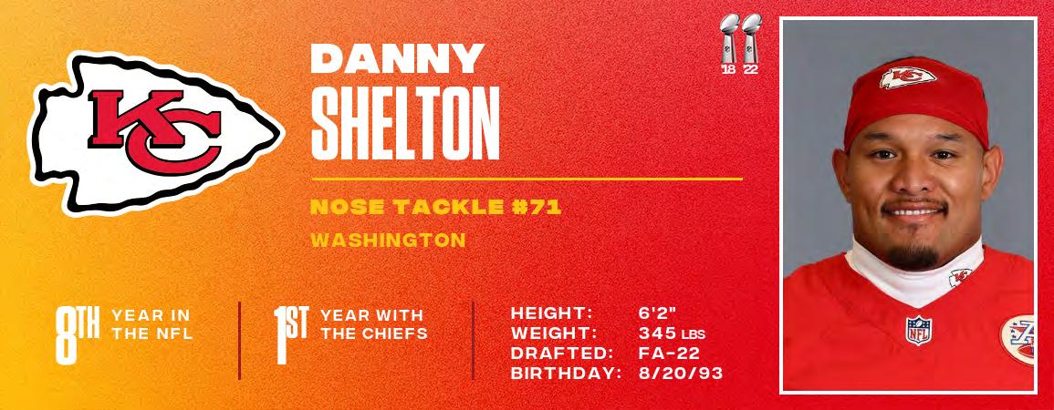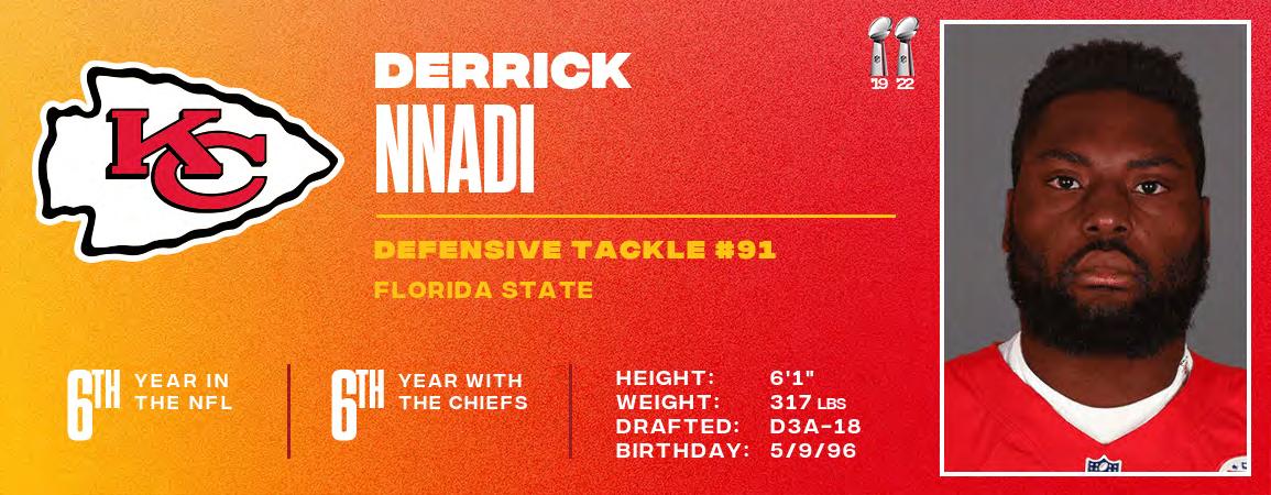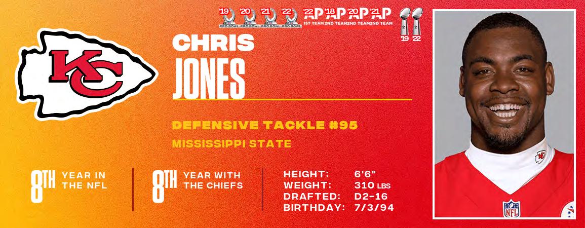Chiefs QB Patrick Mahomes is in his sixth season as the club’s starting quarterback. As the starter, Mahomes has led the team to five-consecutive home AFC Championship Games, three Super Bowl appearances and earned NFL MVP (2018, 2022) and Super Bowl MVP honors (2019, 2022). Since 2018, he leads the league in yards (24,183), touchdowns (194), 25+ yard completions (209) and first down throws (1,193). With only 49 interceptions (since 2018), he owns a +145 TD/INT ratio, the highest mark of any active QB in that span. He owns 41 career games of 300+ passing yards. TE Travis Kelce has recorded an NFL record seven-straight 1,000yard receiving seasons (1,338 yards in 2022). He owns 35 games with 100+ receiving yards (most in NFL history for a tight end) and has caught at least one pass in 161 consecutive games (reg. and postseason). Since entering the NFL in 2013, Kelce leads all tight ends in receiving yards (10,344) and receptions (814). He ranks first in touchdowns (69) and catches of 25+ yards (81). Defensively, DT Chris Jones recorded 15.5 sacks last season and CB L'Jarius Sneed recorded a team-high three INTs.