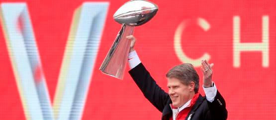 Reid is in his 32nd NFL season, 25th as a head coach and 11th with the Chiefs. In his first ten seasons with the club, Reid tallied 119 regular season wins, more victories than any other head coach in franchise history in that timeframe. Reid’s 70 wins at GEHA Field at Arrowhead Stadium passed Marty Schottenheimer for most wins at the home of the Chiefs (64). In 2019, Reid led the Chiefs to their first Super Bowl appearance and victory in 50 years, bringing the Lombardi Trophy back to Kansas City for the first time since the 1969 season. Additionally, the Chiefs 35-24 victory over the Tennessee Titans in the AFC Championship Game brought the Lamar Hunt Trophy to Kansas City for the first time ever. Under Reid, the Chiefs have made the playoffs nine of ten seasons, including a franchise best 14-2 record in 2020. Reid has led the Chiefs to back-to-back Super Bowl appearances (LIV and LV) and returned to the Super Bowl stage last season where they won Super Bowl LVII.