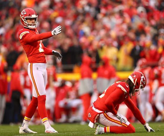 Player (Opponent, Date) Yards 1. Knile Davis (at Houston, 1/9/16) 106 (TD) 2. Dante Hall (vs. Indianapolis, 1/11/04) 92 (TD) 3. Mecole Hardman (vs. Houston, 1/12/20) 58 Punt Player (Opponent, Date) Yards 1. Dustin Colquitt (at Indianapolis, 1/6/07) 66 2. Louie Aguiar (vs. Denver, 1/4/98) 62 3. Jerrel Wilson (at Green Bay, 1/15/67) 61 4. Tommy Townsend (vs. Jacksonville, 1/21/23) 60 5. Dustin Colquitt (vs. New England, 1/20/19) 59 Jerrel Wilson (vs. Minnesoa, 1/11/70) 59 7. Jerrel Wilson (at Oakland, 12/22/68) 58 8. Tommy Townsend (vs. Cincinnati, 1/30/22) 57 9. Dustin Colquitt (at Houston, 1/9/16) 56 Jerrel Wilson (at Oakland, 1/4/70) 56 Field Goal Player (Opponent, Date) Yards 1. Harrison Butker (at Tampa Bay, 2/7/21) 52 2. Harrison Butker (vs, Cleveland, 1/17/21) 50 Harrison Butker (vs, Jacksonville, 1/21/23) 50 Harrison Butker (vs, Jacksonville, 1/21/23) 50 5. Harrison Butker (at Buffalo, 1/23/22) 49 Cairo Santos (at Houston, 1/9/16) 49 7. Cairo Santos (vs. Pittsburgh, 1/15/17) 48 Jan Stenerud (vs. Minnesota, 1/11/70) 48 9. Harrison Butker (vs. Buffalo, 1/24/21) 45 Harrison Butker (vs. Cincinnati, 1/29/23) 45