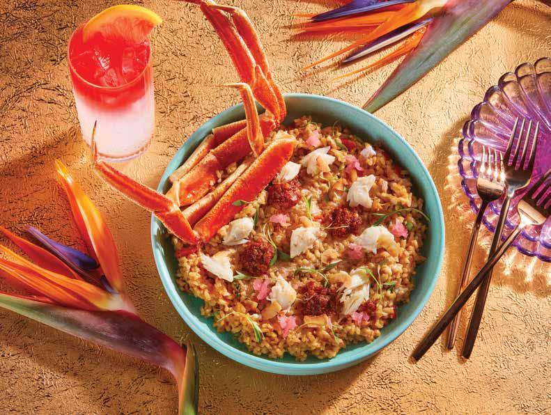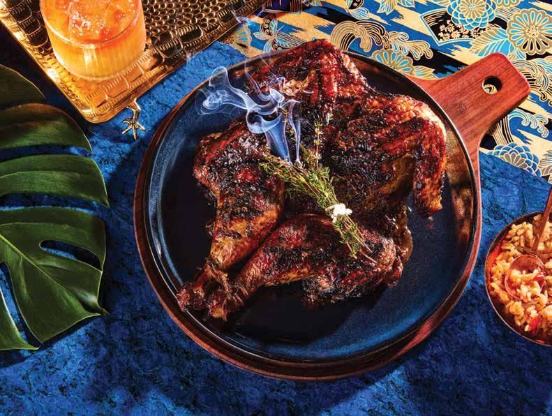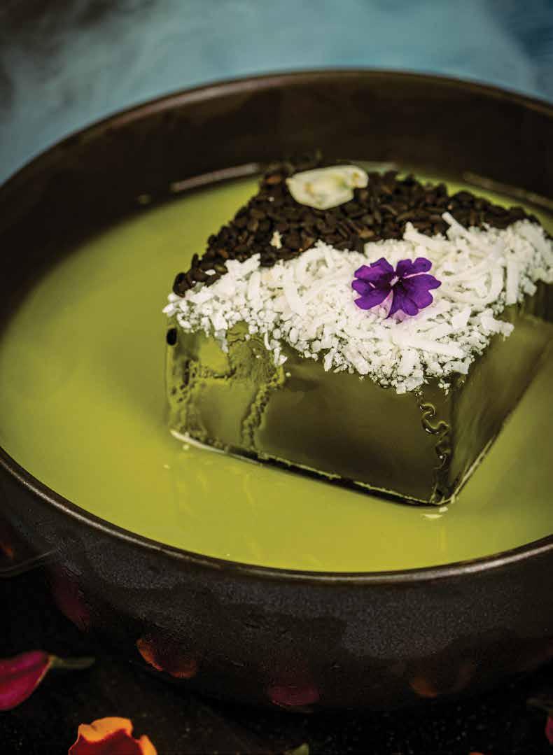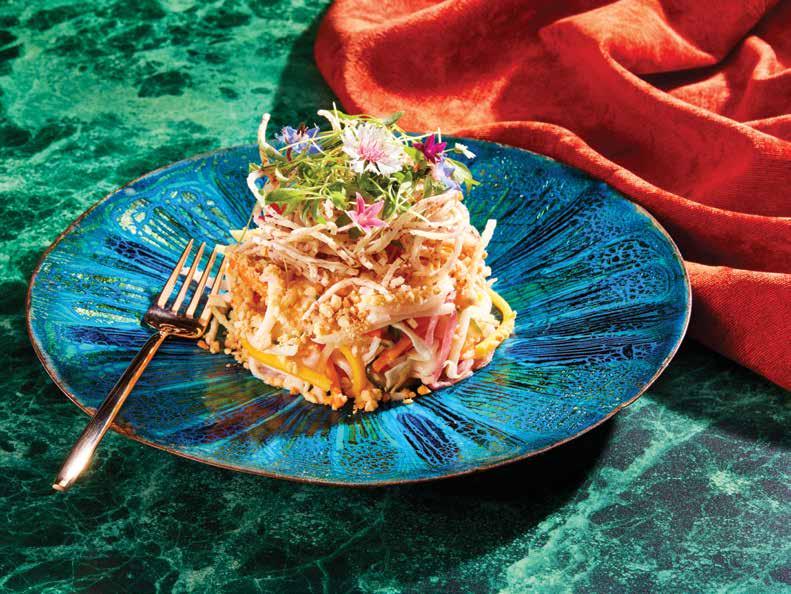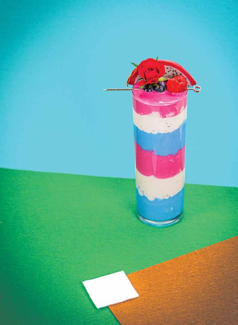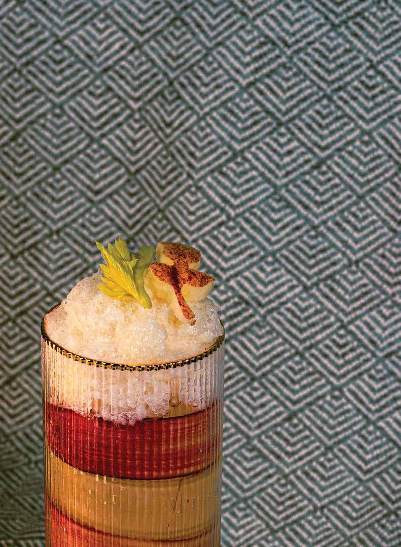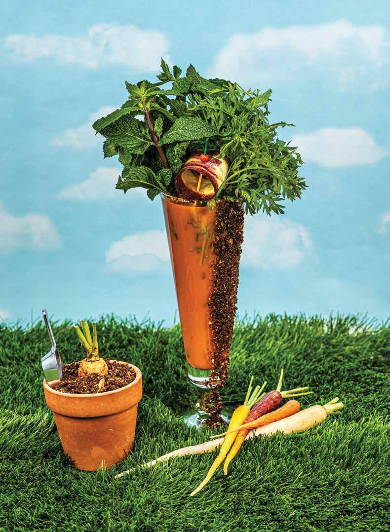 Spiced Honey Syrup, shake it all up and strain into a long, carrotshaped glass. The glass is painted with edible soil (made from raisins, hazelnuts, sesame crackers, pumpernickel, soy sauce, bitters and brown sugar), adding crumbly texture to snack on throughout the drink.