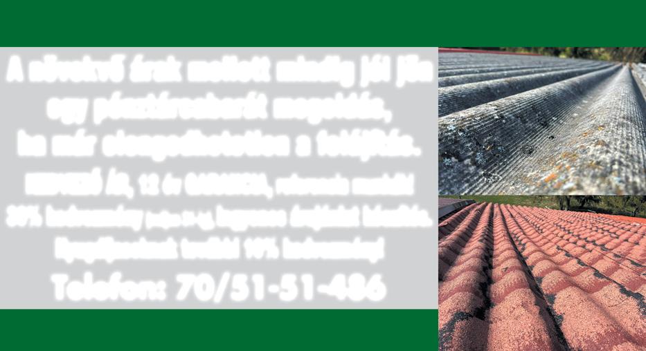 Régi tető javítása, tetőkészítés, bádogos-, ácsmunka, cserepeslemezelés, kúpkikenés, széldeszkázás, ereszcsatornázás, lapostető szigetelés. Május 31-ig nyugdíjasoknak 10% kedvezmény. < 06/20/3628311, 06/30/511-4550