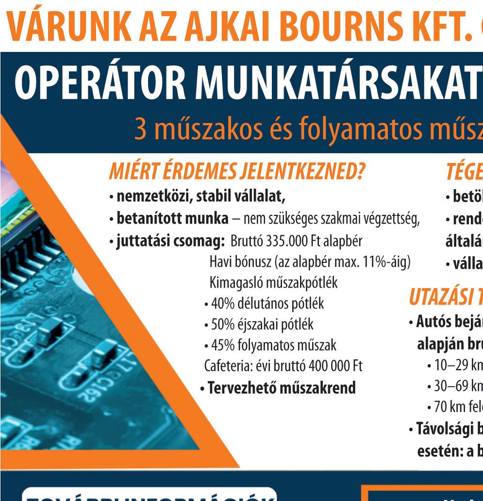 3 műszakos munkarendbe operátorokat többféle területre alapbérek 358.000 - 418.000 Ft/hó kiemelt műszakpótlékok: 20-60% jelenléti prémium, gyerekek iskolakezdési támogatása, 13. havi juttatás, teljesítmény prémium élelmiszer csomagolókat – alapbér 322.800 Ft/hó műszakpótlék 30-60%, cafeteria termékcsomag juttatás, 13. havi bér keresünk azonnali kezdéssel! Jelentkezz még ma! 70/514-4897, 20/9292-430