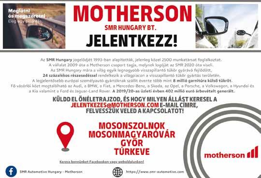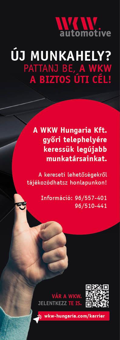 Arrabona Állásbörze Grosshaus Hungaria Kft. Német családi tulajdonban lévő, fém autóalkatrészeket gyártó vállalat, ügyfelekkel a világ minden tájáról. Nyitott pozícióink: • OPERÁTOR • SZERSZÁMAKARBANTARTÓ • GÉPBEÁLLÍTÓ-GÉPKEZELŐ • ESZTERGÁLYOS • FOLYAMATMÉRNÖK Jelentkezéseket az alábbi lehetőségeken várjuk: Személyesen: 9027 Győr, Platánfa u. 6. Telefonon: 0696/526-300 E-mailben: info@grosshaus.hu FELADATOK, AMIK RÁD VÁRNAK TAKARÍTÁSHELYBEN SÜTÖTT PÉKÁRUK MEGSÜTÉSE ÁRUPAKOLÁS KASSZÁZÁS Kezdd el a pályafutásod az Értékesítésben és dolgozz Bolti eladóként! heti 35 óra kezdő bruttó bér 342 650 Ft karrier.aldi.hu HR_hirdetes_148x102mm_Gyor.indd 1 2022. 08. 29. 12:38 30.
