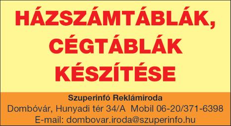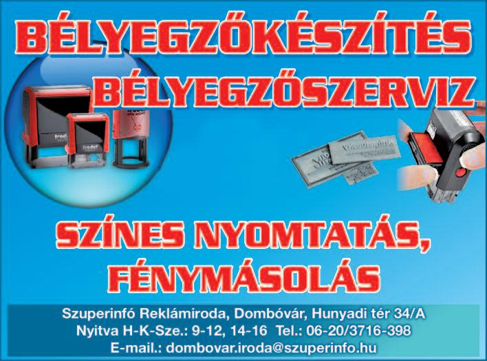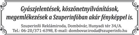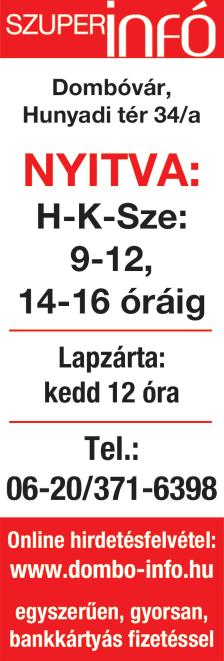 Nyitva: H-K-Sze: 08-12 14-16 E-mail: dombovar roda@szuperinfo hu • www szuper nfo hu Kiadó: T és TN Kft Székhely: 7361 Kaposszekcső, Napsugár u 9 Felelős kiadó és szerkesztő: Te bert Csaba