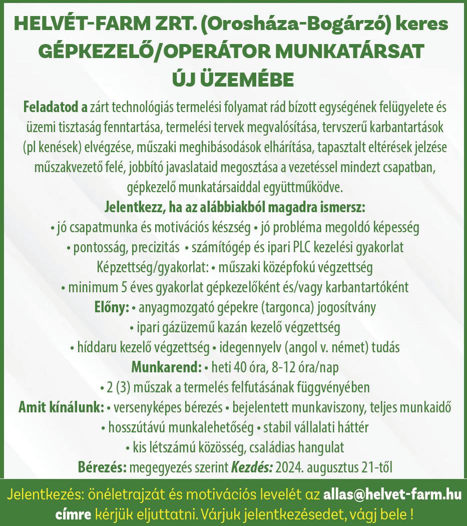 Elvárás: géplakatos végzettség, vagy hasonló munkakörben szerzett gyakorlat.