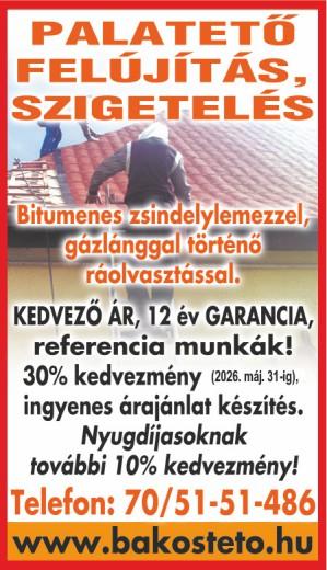 Régi tető javítása, tetőkészítés, bádogos-, ácsmunka, cserepeslemezelés, kúpkikenés, széldeszkázás, ereszcsatornázás, lapostető szigetelés. Áprilisban nyugdíjasoknak 10% kedvezmény 06-20/362-8311,06-30/511-4550