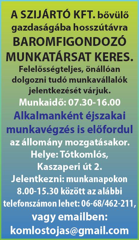 • Hétvégi munkára kisegítőt keresek nagyszénási, orosházi (férfi-női) rendezvények lebonyolításához. (Katona) 06-30/525-2692