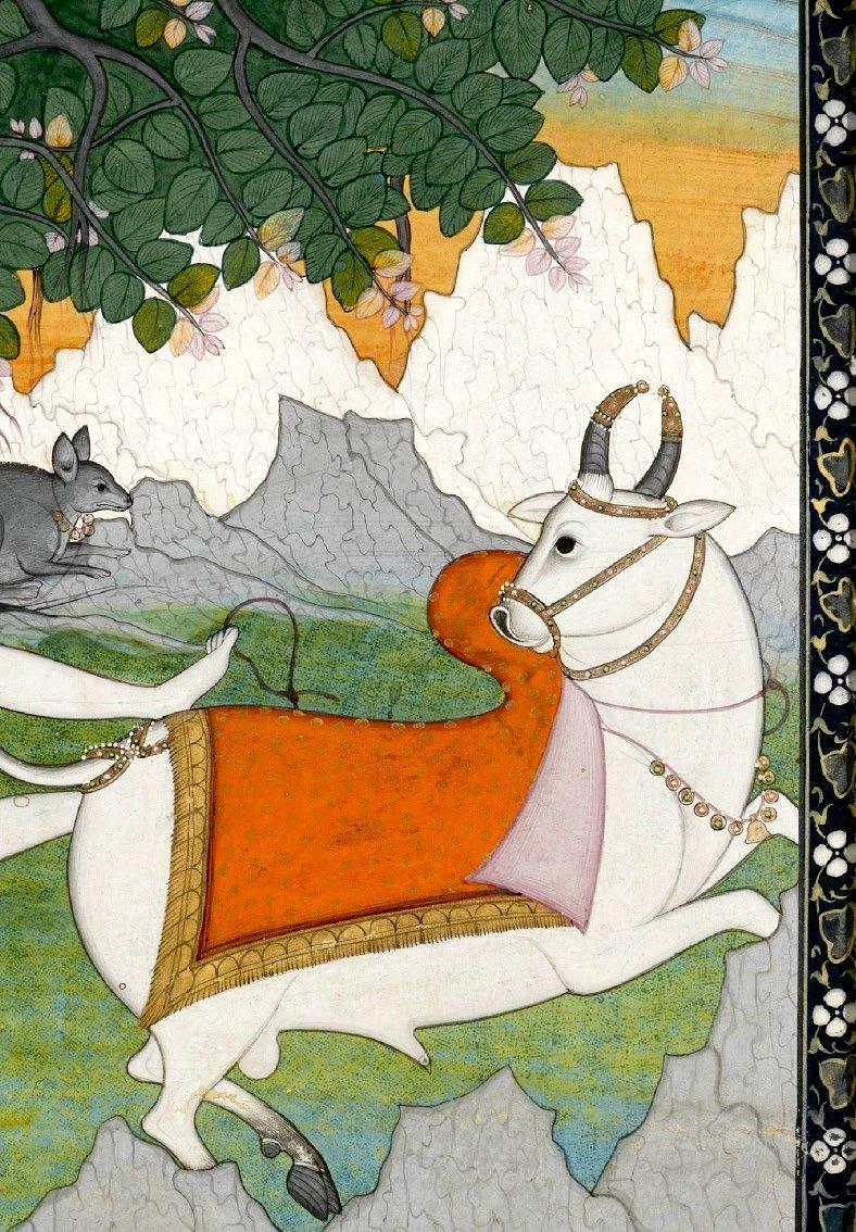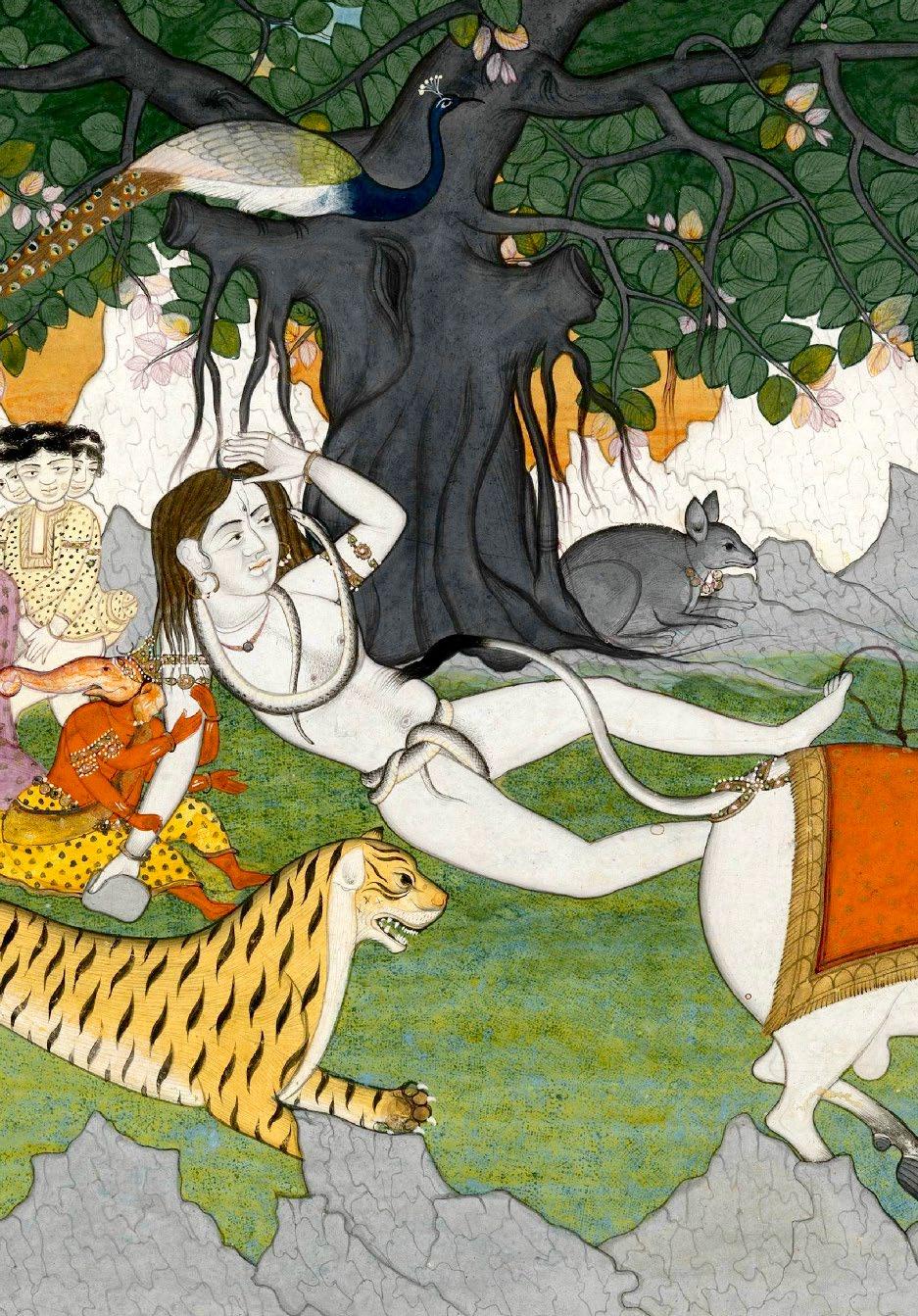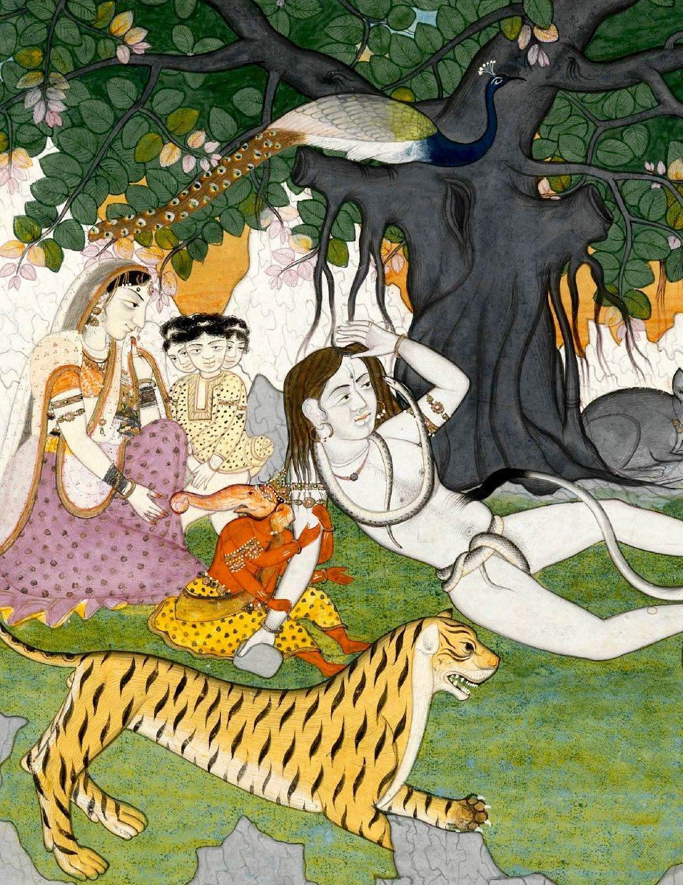 The present painting depicts Lord Shiva and his wife Parvati, as well as their two sons, Karttikeya (Skanda) and the elephant-headed Ganesha. Their respective vahanas (vehicles) are shown here as well–Parvati’s tiger, Karttikeya’s peacock, Ganesha’s rat, and Shiva’s sacred bull, Nandi. Shiva reclines against a banyan tree in a drunken stupor as the young Ganesha clutches at his arm. He is shown here in the nude except for two vine-like snakes that serve as his undergarments and necklace, mirroring the god’s characteristic matted locks and the aerial roots of the banyan tree above. In his right hand he holds a cup of Bhang, a traditional Indian beverage infused with cannabis–often associated with Shiva and his devotees–which is said to help Shiva focus inward, allowing him to harness his divine powers.
