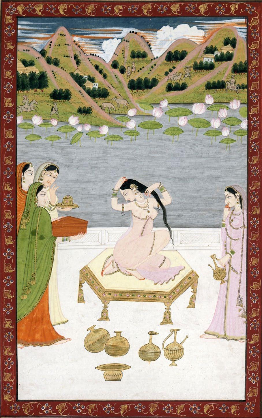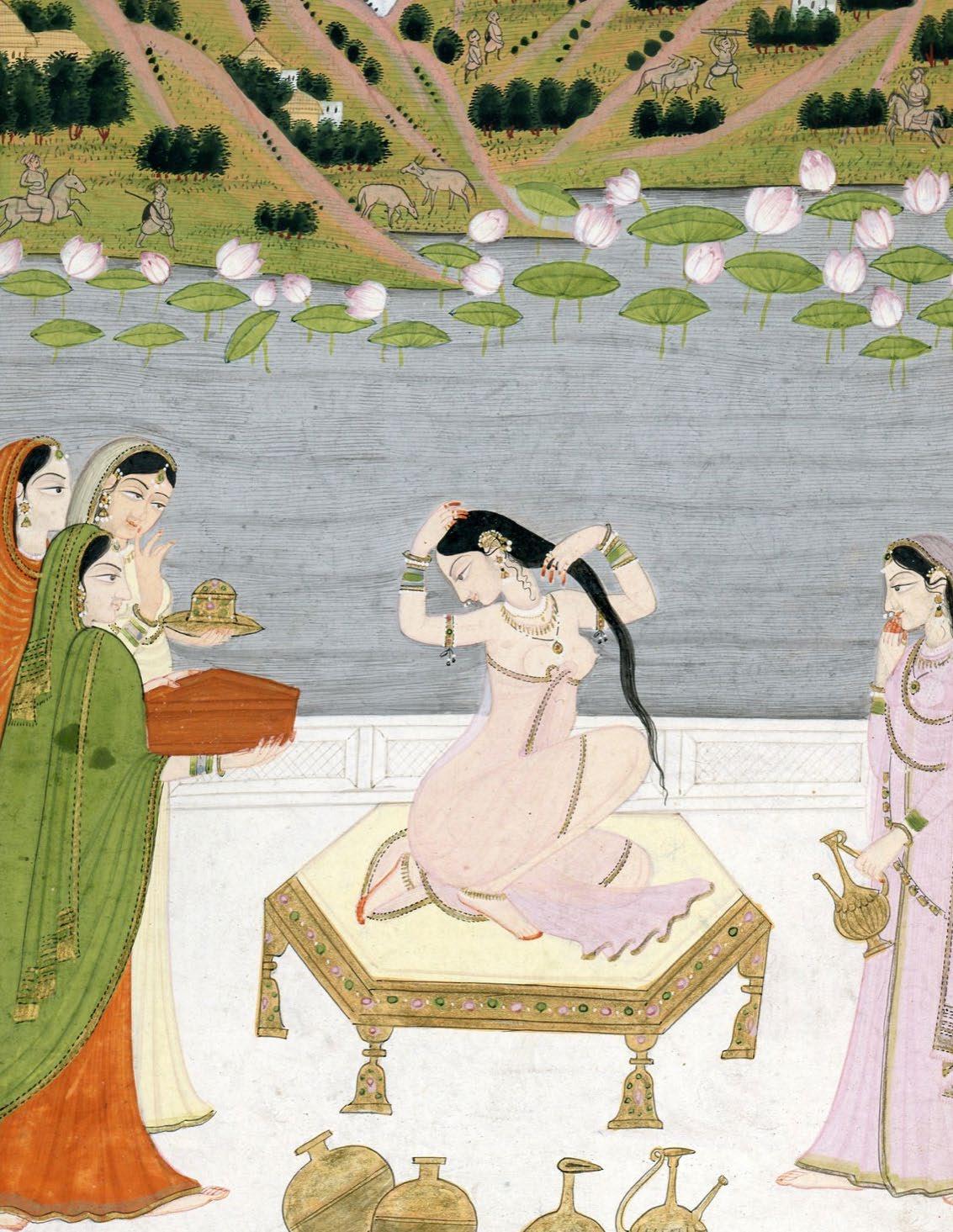 A nayika kneels on a gold and jeweled plinth, naked except for a transparent wrap and gold jewelry. Her lithe body turns as she wrings out her long black hair on the white marble terrace of the zenana. The woman is accompanied by four attentive handmaidens holding vessels that contain body oils, perfumes, ointments and lac for the palms of her hands and soles of her feet. As she prepares to greet her lover, the air is tense with anticipation. The blue, cloudy sky is streaked with red, rendering an evening sunset. In the middle distance rises a gray lotus-filled pond, the blossoms and leaves large and freshly blooming. In the far distance, a village set among steep hillsides is visible. Amidst its population of cowherds and small structures, two tiny mounted nobles gallop in from the left and right.