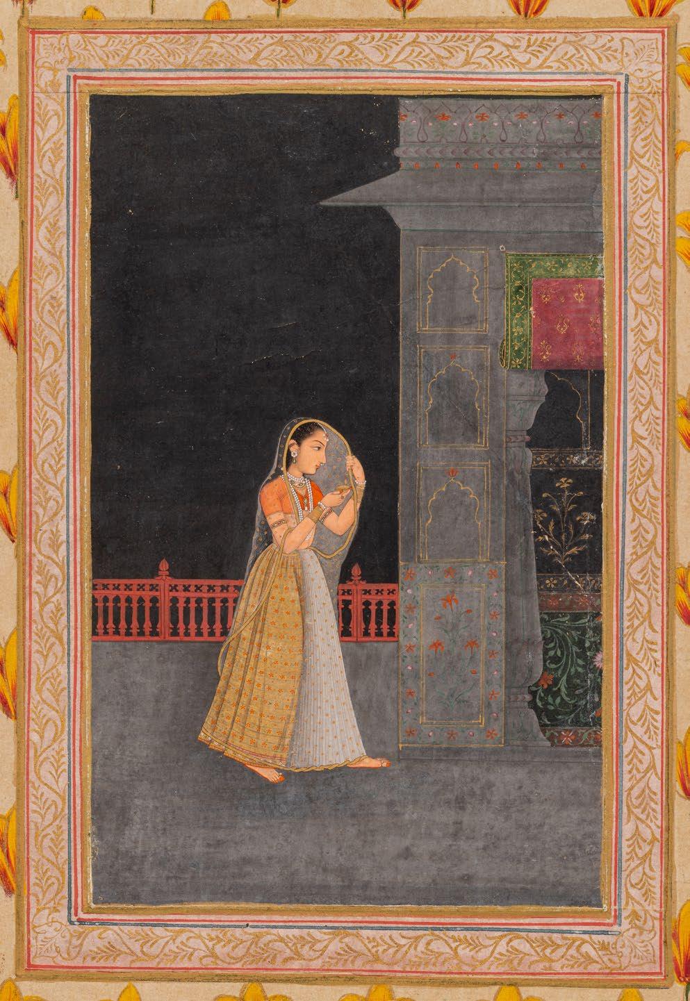 Princess Strolling Across a Palace Terrace at Night Lucknow, Awadh, India, circa 18th century Gouache painting on paper heightened with gold leaf Image: 7 1/8 x 4 7/8 in. (18.1 x 12.4 cm.)