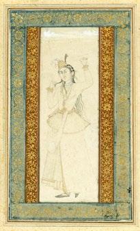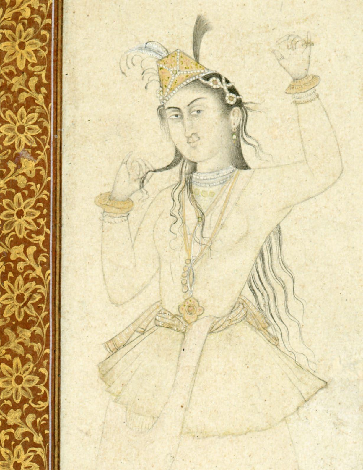 The young dancer’s long wavy black hair falls in slender tresses down her back and over her shoulder. She is dressed in a Safavid Persianate manner and faces the viewer in three-quarter pose. She places her weight on one leg and twists rhythmically, her left hand raised up above her head and her right playfully pinching out a strand of hair. A feathered and gold cap with strands of pearls, gold bracelets and necklaces adorn her figure from head to foot.