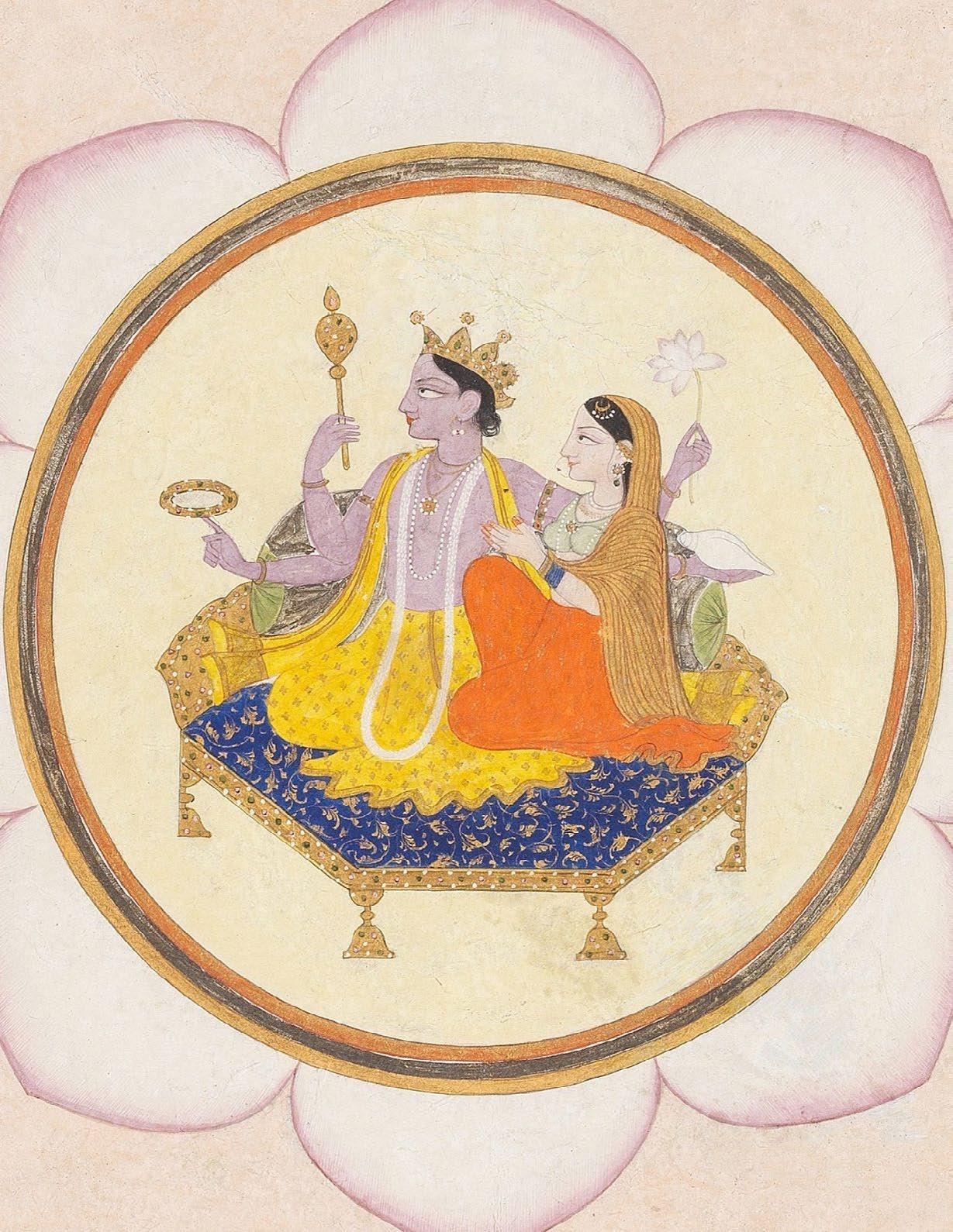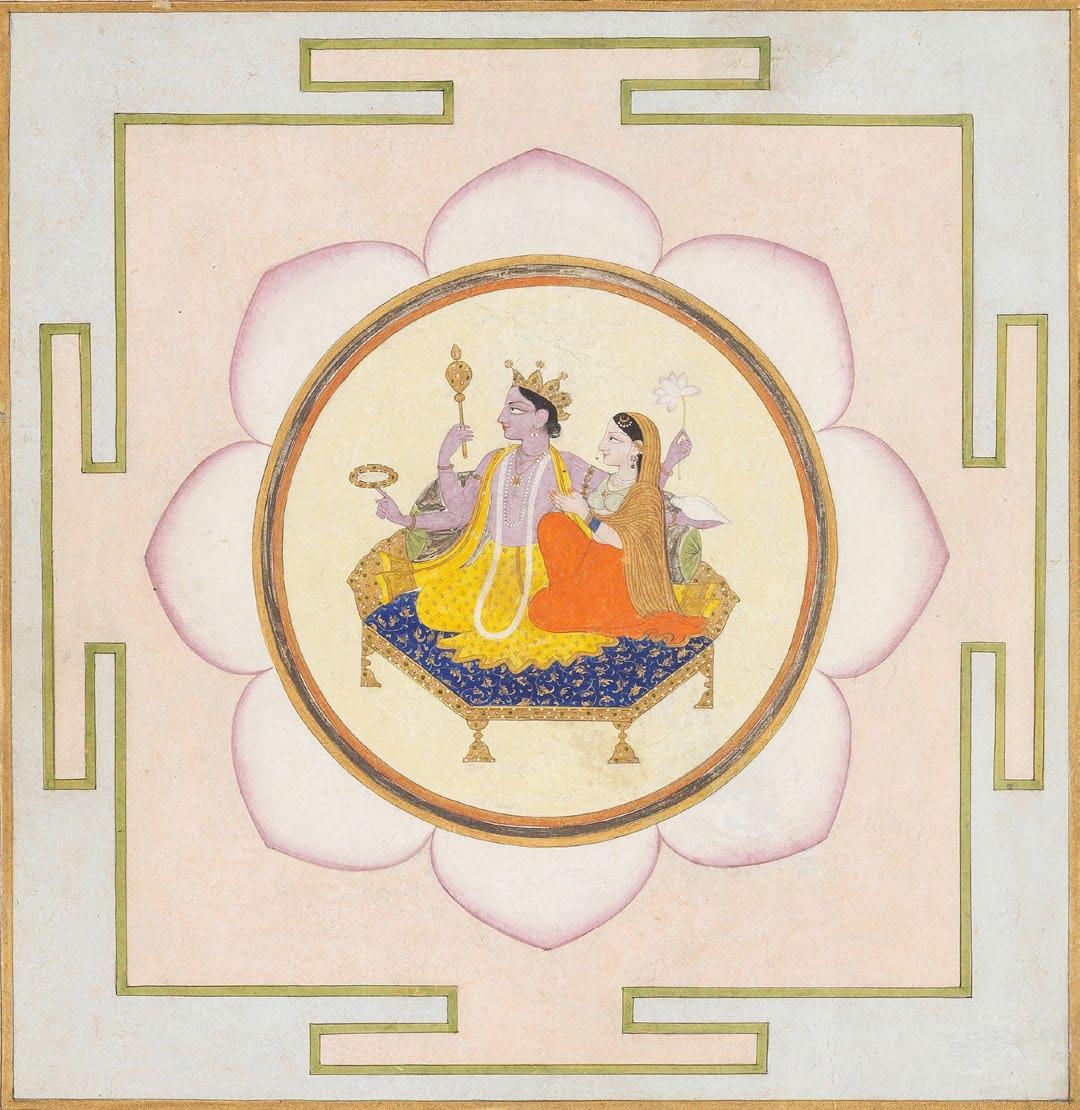 Lakshmi-Narayana Enthroned Kangra, dated Samvat 1845 (1788 C.E.) Opaque watercolor heightened with gold on paper 8 ¼ x 8 ⅛ in. (21 x 20.7 cm.)
