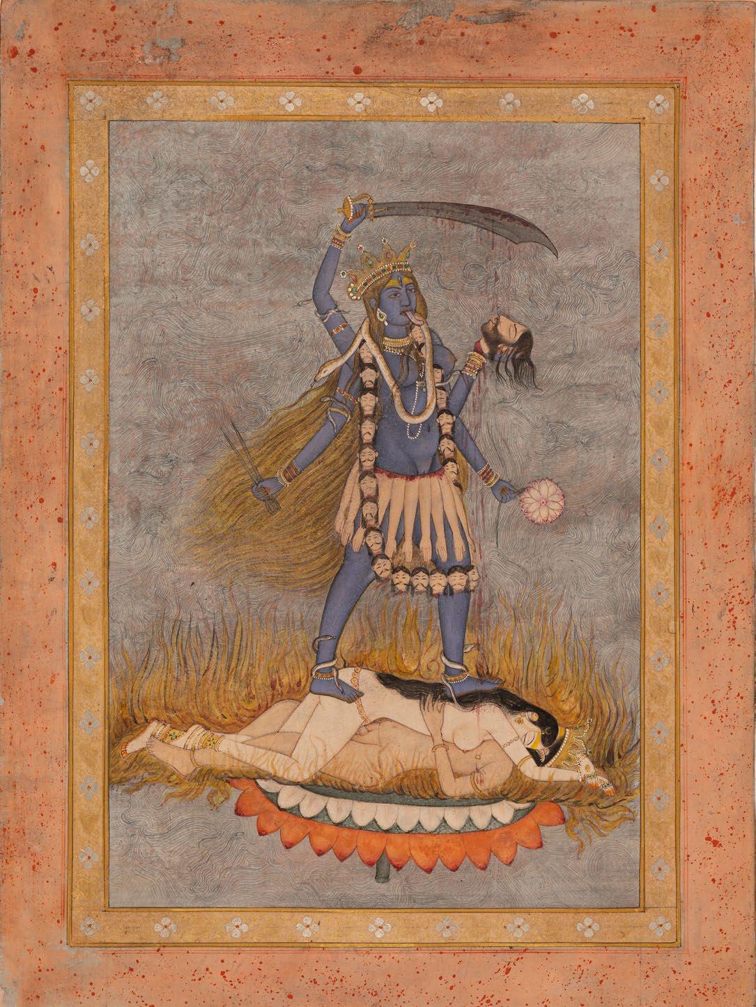 Kali Dances on Two Lovers Kangra, Himachal Pradesh, India, circa 1840 Ink, opaque watercolor, and gold on paper Image: 8 1/2 x 5 3/4 in. (21.5 x 14.6 cm.)