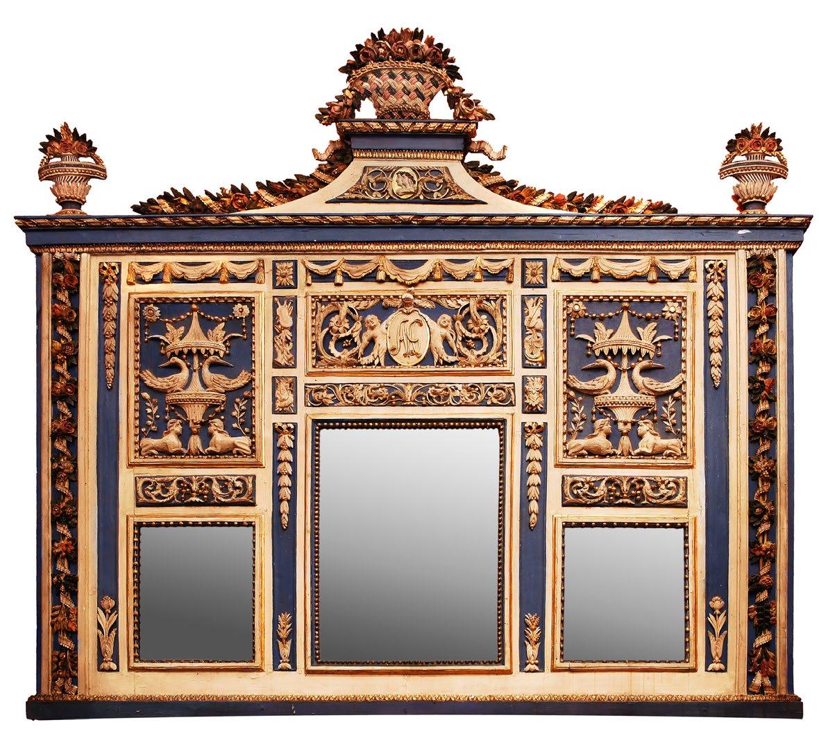 A Polychromed and Gilded Poplar Wood Caminiera with Mirror Glass Lombardy, Italy, late 18th century Made for Antonio Greppi for Palazzo Greppi, Milan (With the initials AG), attributed to Giocondo Albertolli 70 1/8” H x 74 3/8” W (178 x 189 cm.)