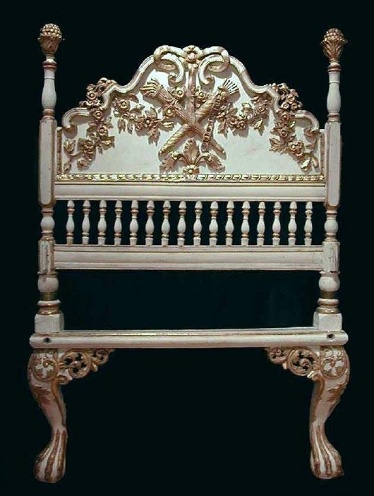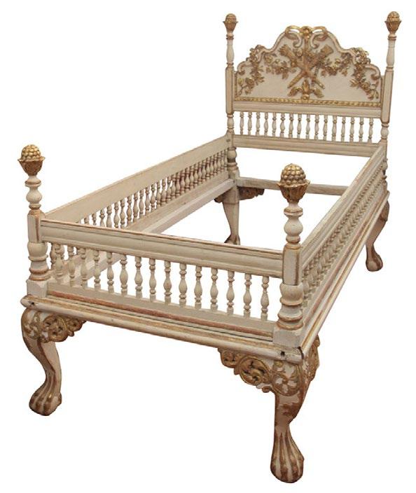 The second bed (below) is of painted white and gilded wood circa 1765-1785 has finely carved side and foot rails, which can be removed (but have neither been lost nor damaged). The 60” high headboard is centered by a panel with a gilded torch crossing to a gilded quiver, this surrounded with carved, and gilded, flowers. Each post has a leaf-carved finial holding a pomegranate cluster. The bed is supported by cabriole shaped legs that transition into animal paw feet. The mattress for the bed would be 39" wide x 80" long. This bed was surely made for an important noble.