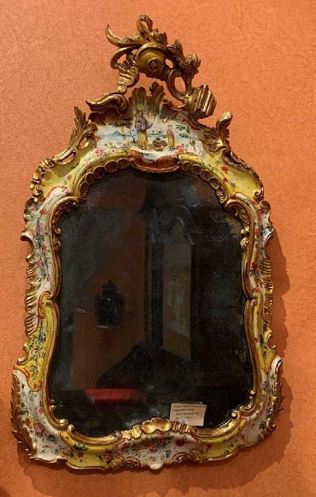 An example, a mirror (1) made for a lady to help her in her "toilette" was very special. Instead of the run-of-the-mill, this was lacquered ivory and decorated with scenery and flowers in blue, green, and peach with gilded elements. Another mirror (2) from the same period circa 1730, a little larger than the norm, was lacquered again in ivory with large, gilded carvings of a flower and leaves on its summit and has chinoiserie decorations.